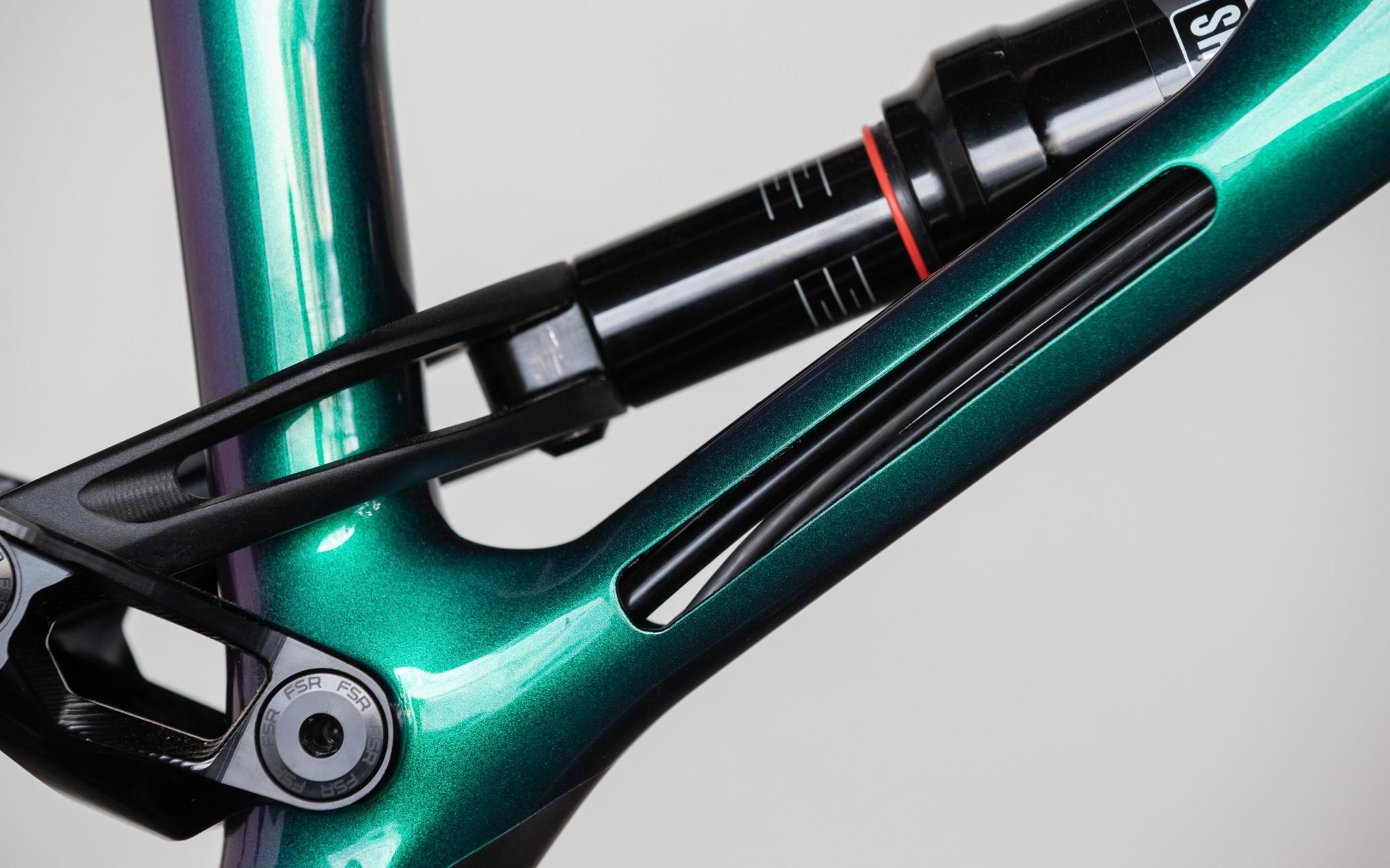 La suspension reste donc l’inévitable Four Bar Linkage FSR cher à la marque, avec 150mm de débattement, mais l’amortisseur RockShox Deluxe reçoit un setting spécifique par rapport au Stumpjumper, alors que la biellette est aussi différente de celle du Stumpjumper pour offrir plus de rigidité avant tout, plus que pour modifier la courbe de compression. On dispose aussi toujours des deux positions, histoire de pouvoir faire varier l’angle de direction de 0,5° et d’abaisser le boîtier de 10mm (plus d’infos au chapitre géométrie et tailles de roues). A noter aussi qu’il est tout à fait possible de monter un amortisseur à air plus gros ou à ressort si on le souhaite.