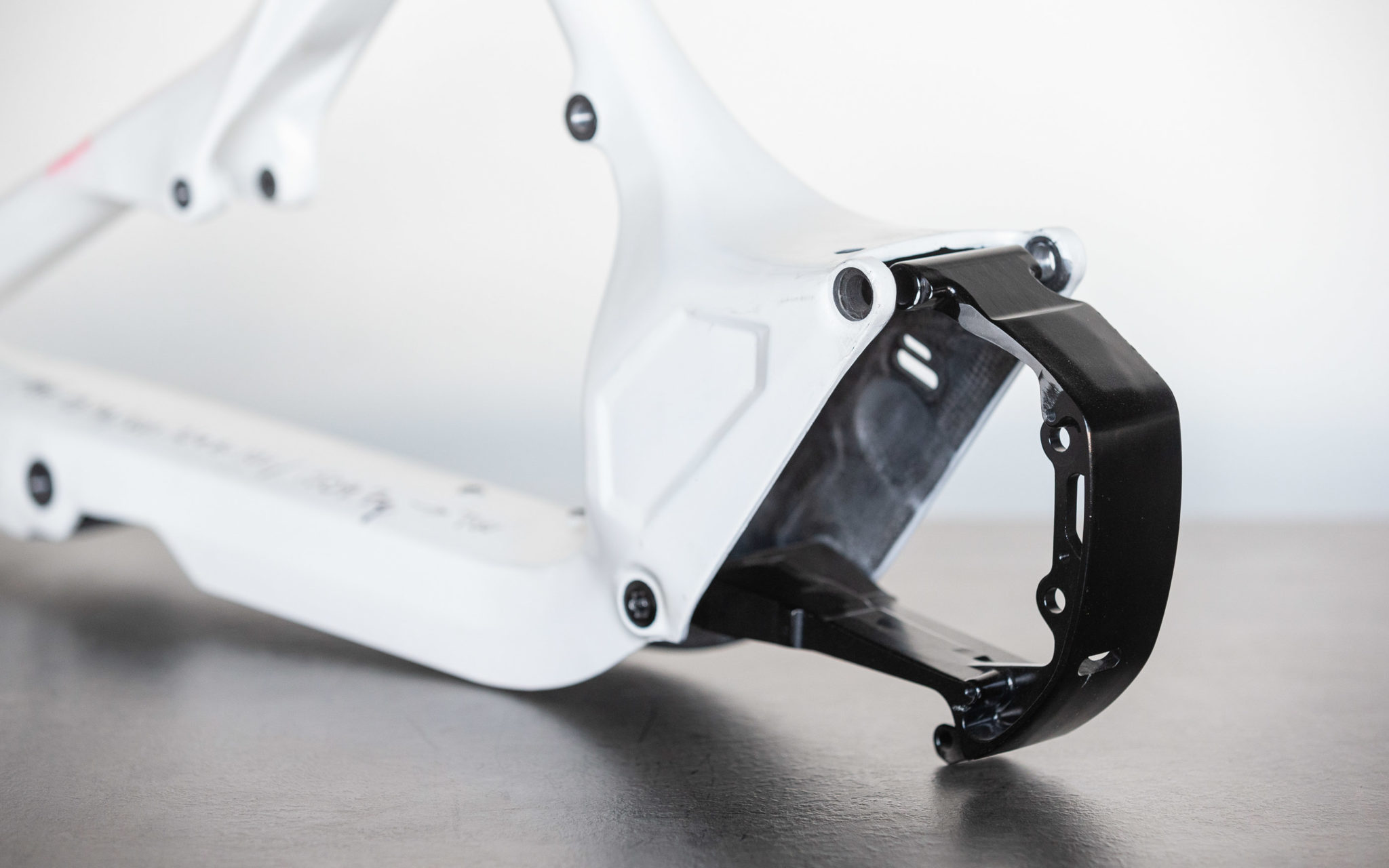 Le passage des gaines et de la Durit de frein arrière a aussi été complètement revu. Tout ce beau monde ne se retrouve plus coincé entre le cadre et la batterie, mais passe par le tube supérieur et par le renfort près de l’amortisseur. « C’est plus direct et beaucoup plus simple pour les mécanos à l’heure de la maintenance. Sur l’alu, on a un accès direct derrière l’amortisseur car le renfort est en forme de demi-lune, et sur le carbone où le tube est fermé, tout est guidé. Nous avons aussi un petit système bien pratique pour la tige télescopique, dont le câble se passe aussi en deux secondes, » nous affirme Vincent Patureau en joignant le geste à la parole.