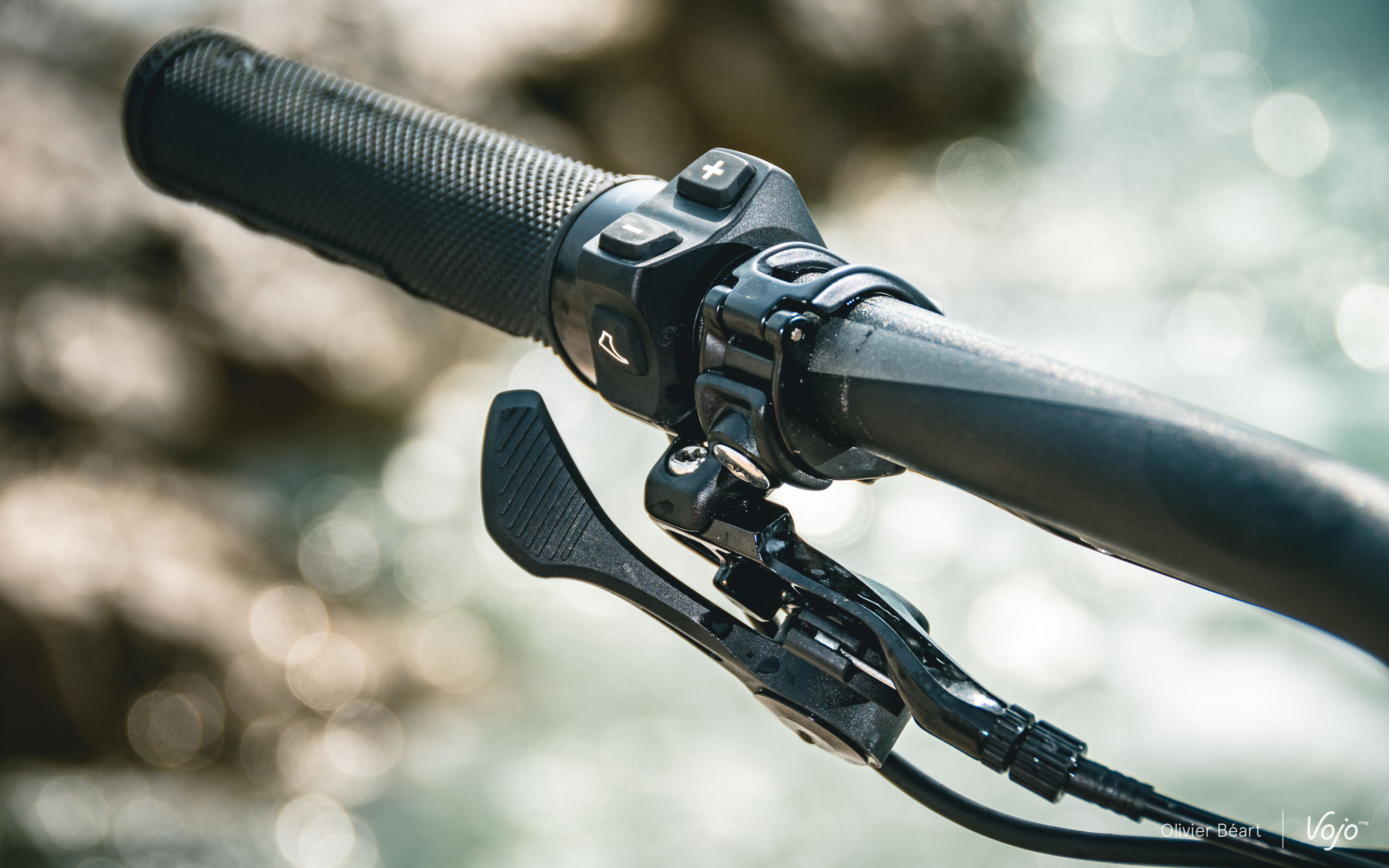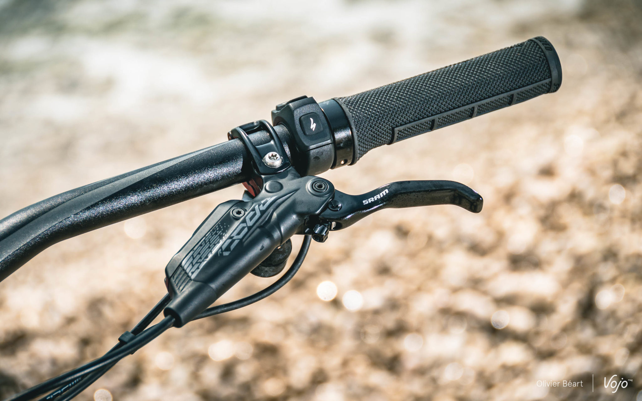 Sur le cintre, Specialized reste fidèle à sa philosophie de poste de pilotage épuré, avec une discrète commande accessible au pouce gauche. Reprise du précédent Levo, elle permet juste de faire varier les modes d’assistance (Eco, Trail et Turbo), d’actionner le mode marche (revu pour vraiment aider à faire avancer le vélo et à décharger le pilote de son poids lorsqu’il marche) ainsi que le petit bouton « boost » qui permet de passer directement en mode Turbo.
