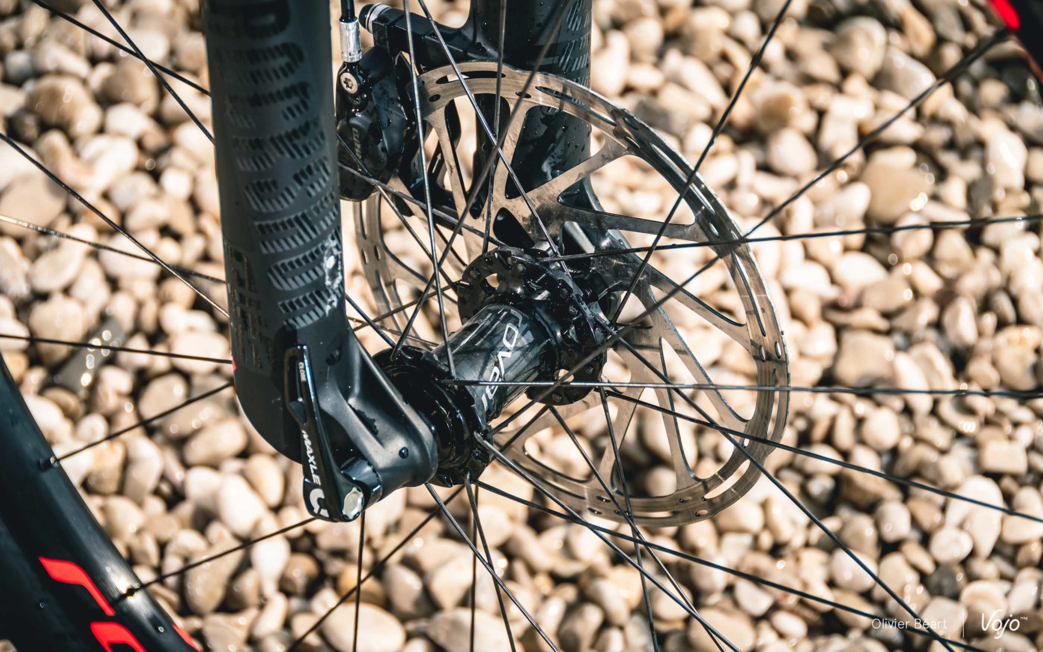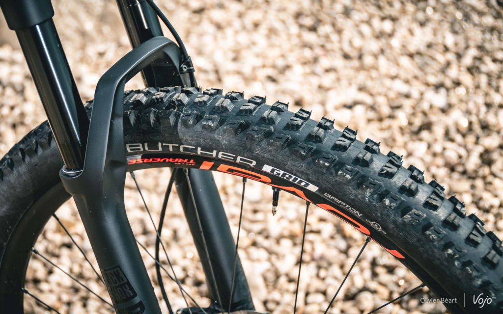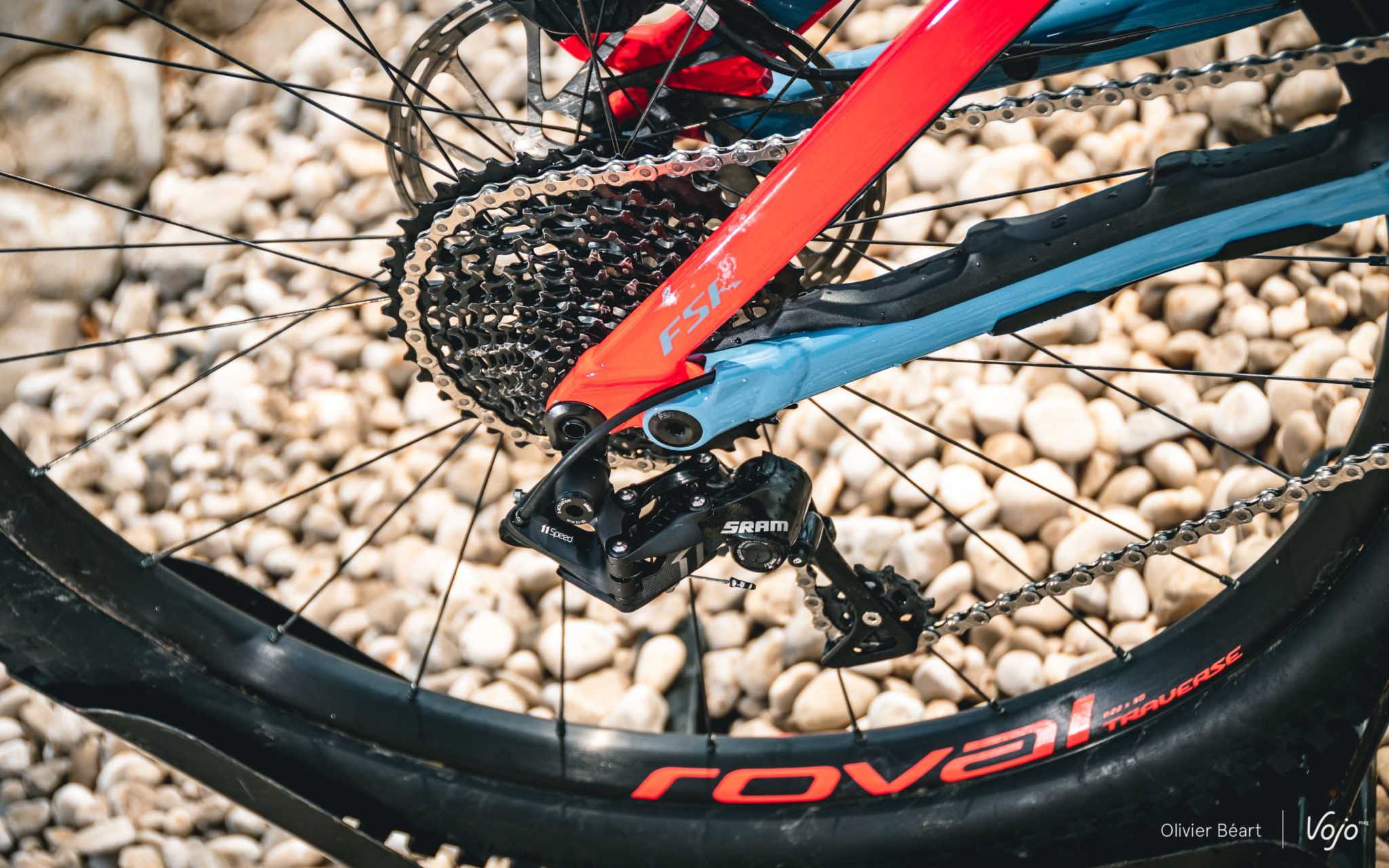 Au niveau de la philosophie de montage de l’ensemble des versions, outre les roues en 29×2.6″ dont nous avons déjà parlé, sur le haut de gamme on note la présence de nouveaux moyeux sur les roues Roval Traverse. Ceux-ci permettent d’utiliser des rayons de même longueur de chaque côté et d’avoir des roues symétriques, plus rigides. Les jantes sont en 30mm de largeur sur toute la gamme.