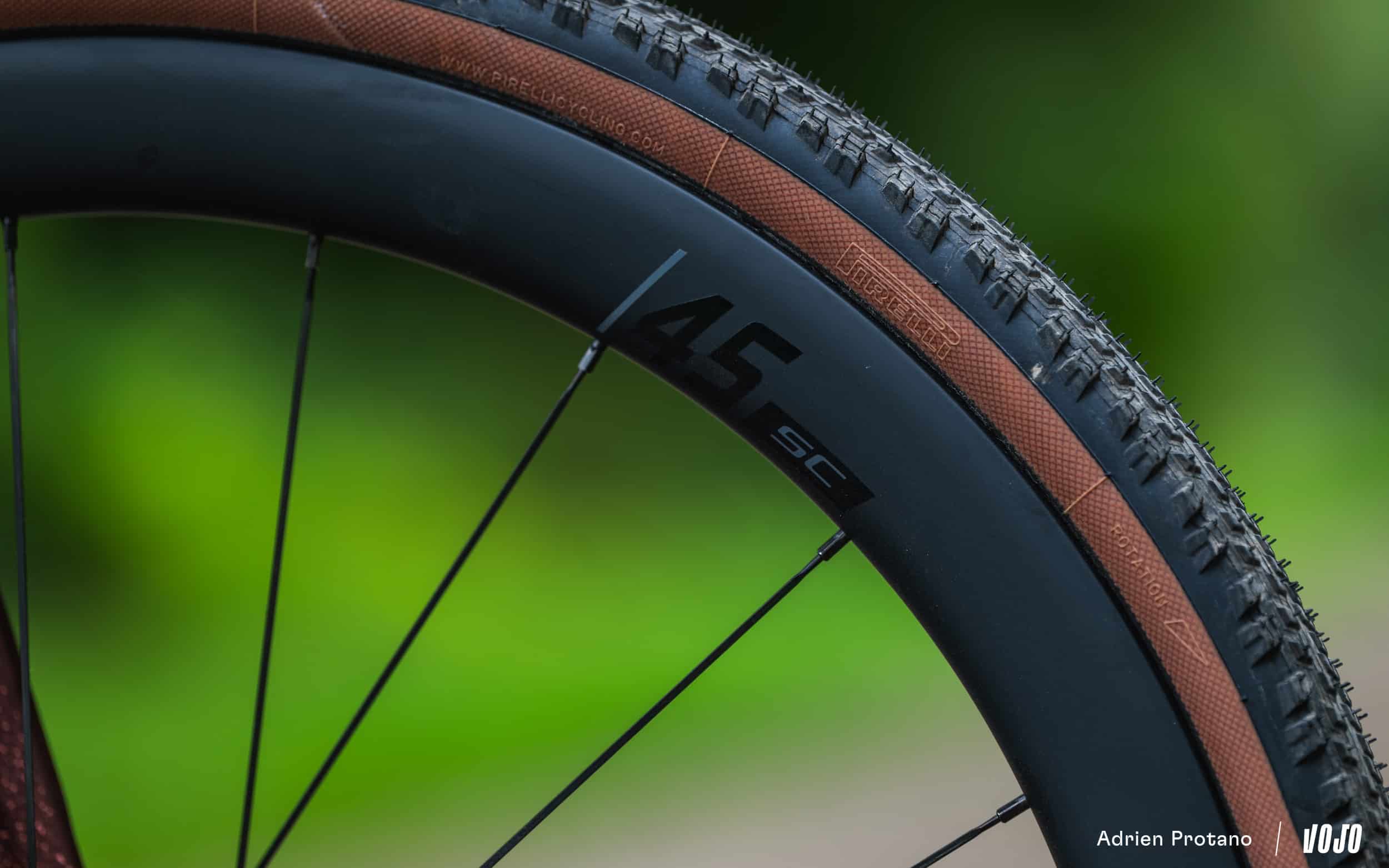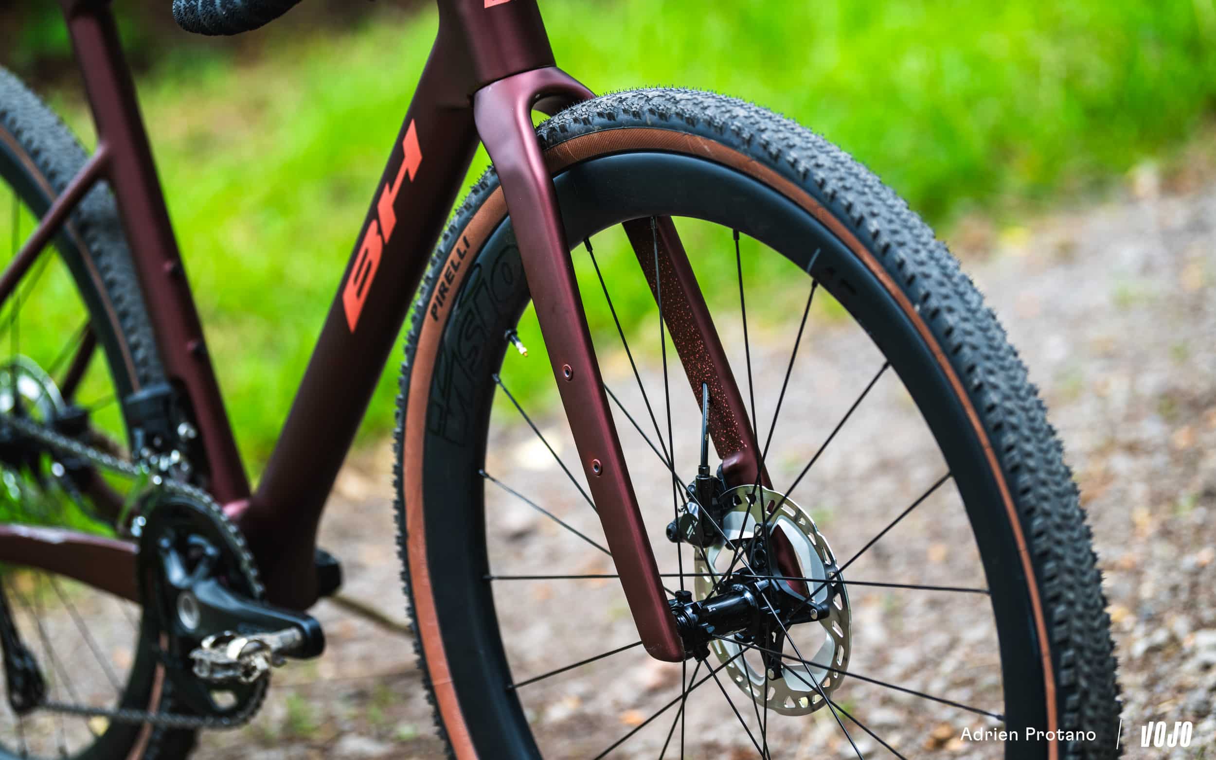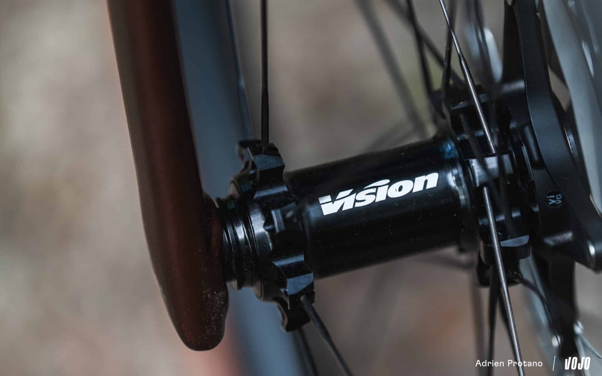 Le train roulant est toujours composé de roues Vision SC45 avec jantes en carbone (45 mm de haut, 21 mm de largeur interne) chaussées de pneus Pirelli Cinturato Gravel en 40 mm. On notera toutefois que le cadre accepte le montage de pneus jusqu’en 45 mm.
