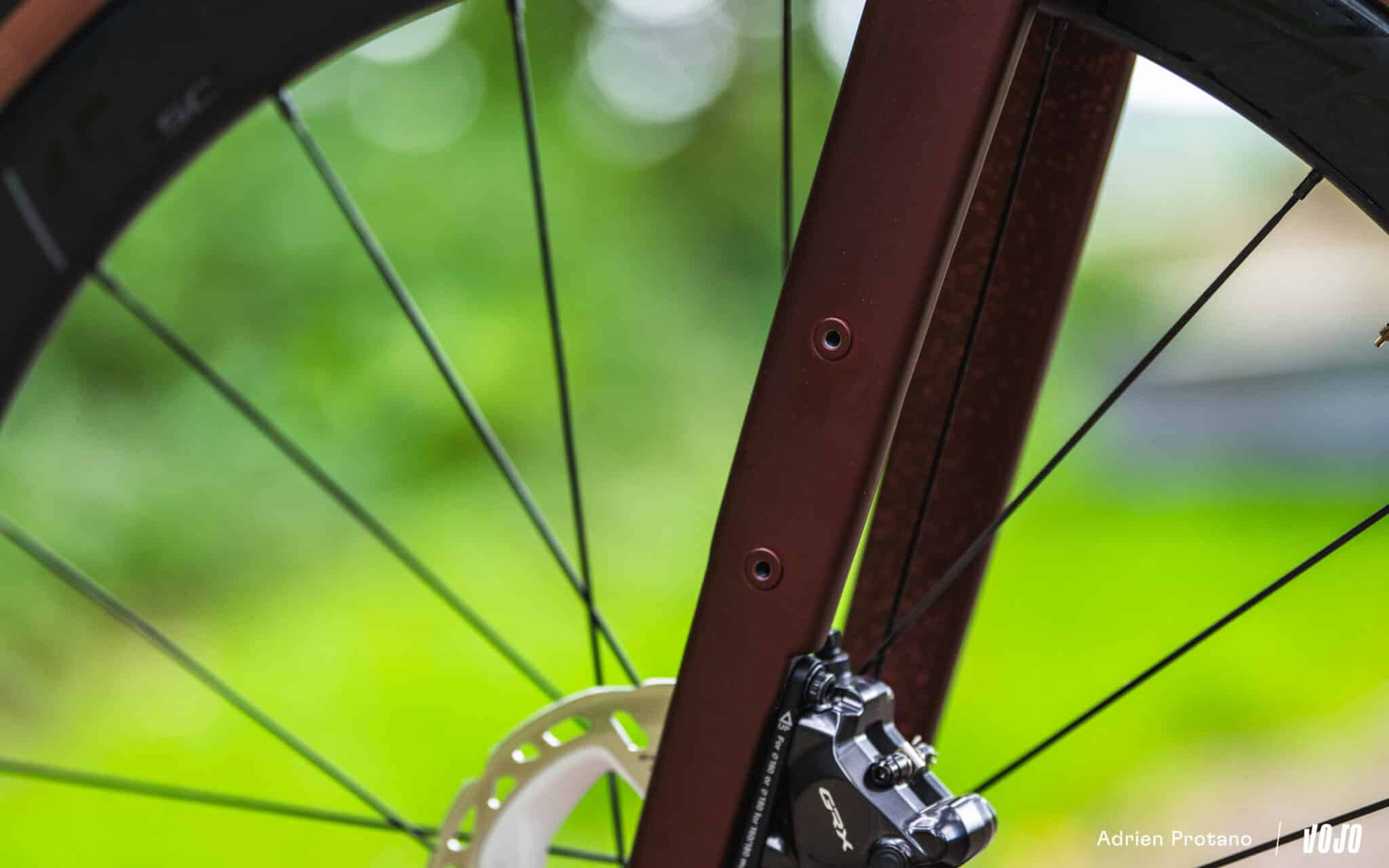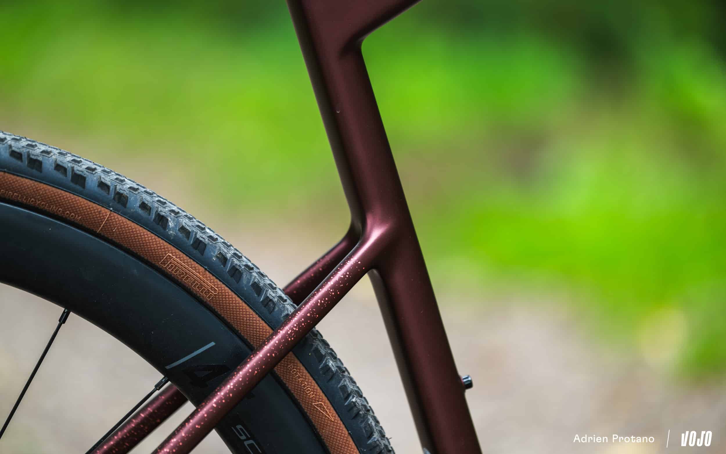 Revers de la médaille, on perd indéniablement en confort. Si la construction du cadre permet de continuer à dissiper une partie des vibrations, cela ne peut pas rivaliser avec une petite suspension, même minimaliste, comme on en trouve sur le Gravel X ou sur le Cannondale Topstone. Mention très bien tout de même pour la fourche qui apporte un réel plus en confort et qui permet aussi d’avoir un avant du vélo qui reste assez facile à maîtriser quand cela tabasse. On recommandera tout de même de monter des pneus en 45mm pour gagner encore un peu plus en confort sans réellement perdre en rendement, comme le font nombre de spécialistes du gravel sur les épreuves rapides.