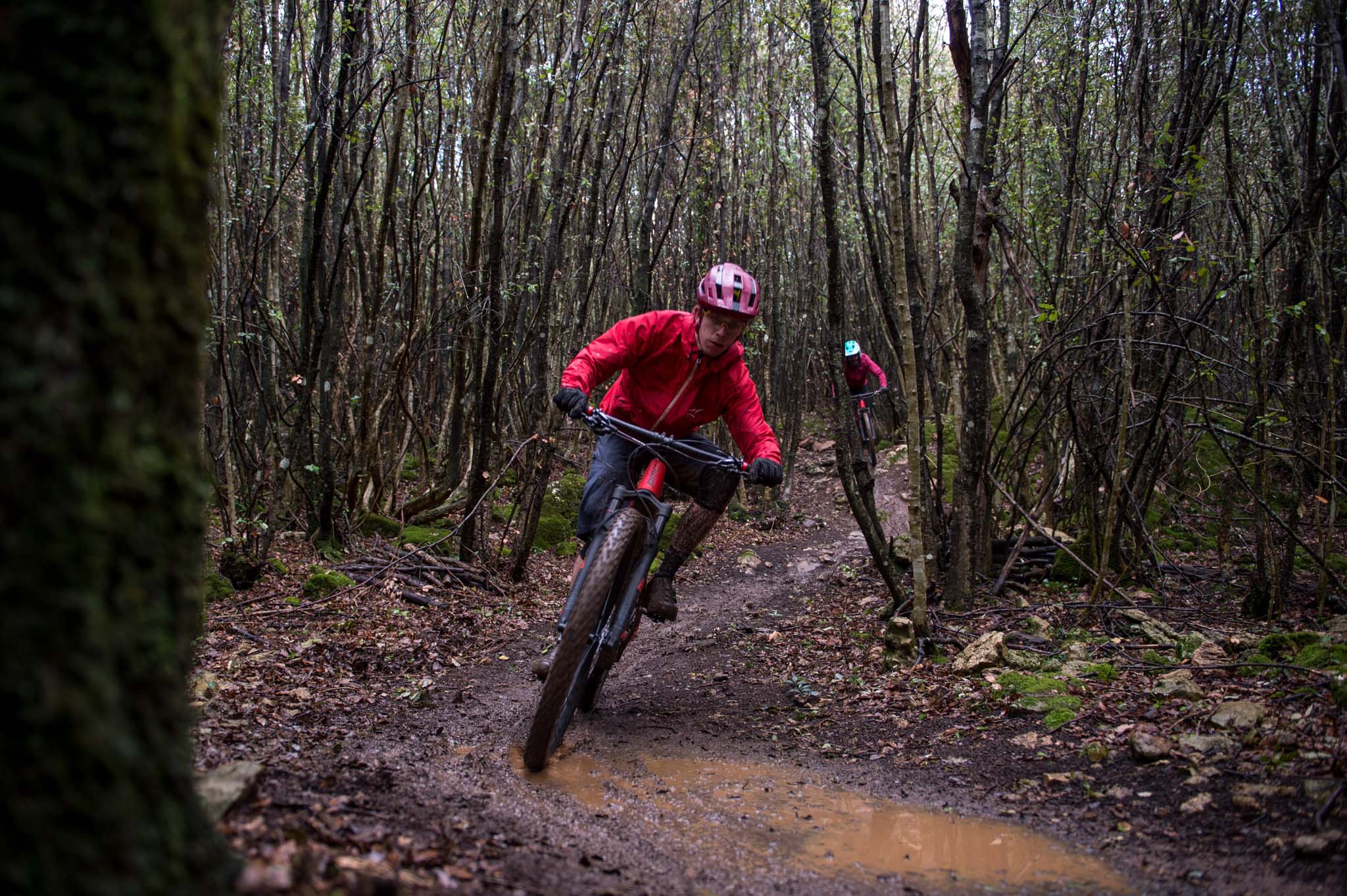 Dans la boue, les pneus du Speedfox ne s’en sortent pas trop mal côté grip mais aurait aimé retrouver une section encore un peu plus grosse. Une fois en descente, on sent que la machine est moins agressive que le Trailfox et une légère inertie se fait ressentir à basse vitesse. Le poids du vélo, sa batterie fort portée sur l’avant, son moteur et ses grandes roues on parfois un peu de mal à tenir le rythme dans les portions techniques. Cependant, le comportement global de la machine reste très homogène et sain.