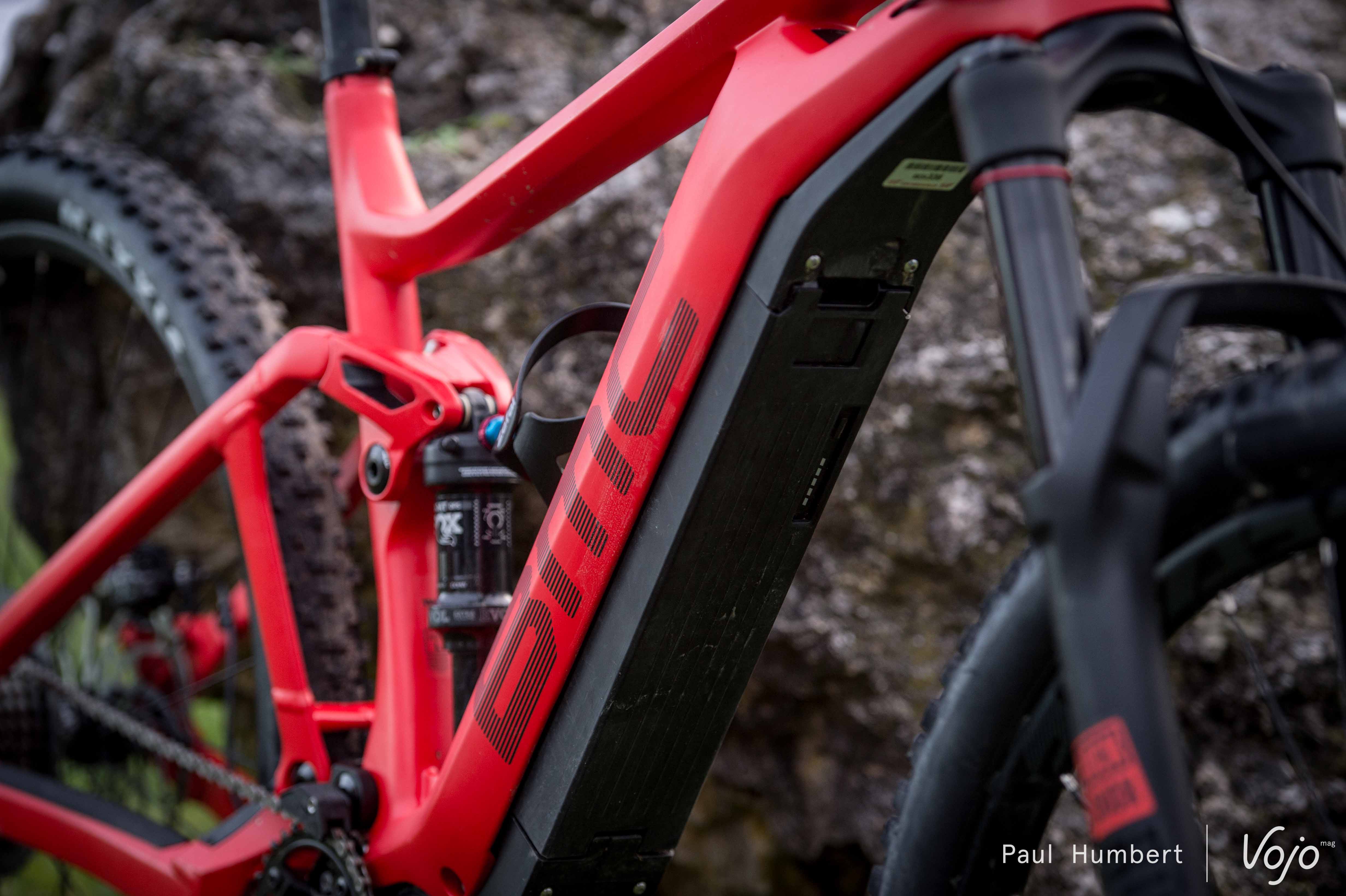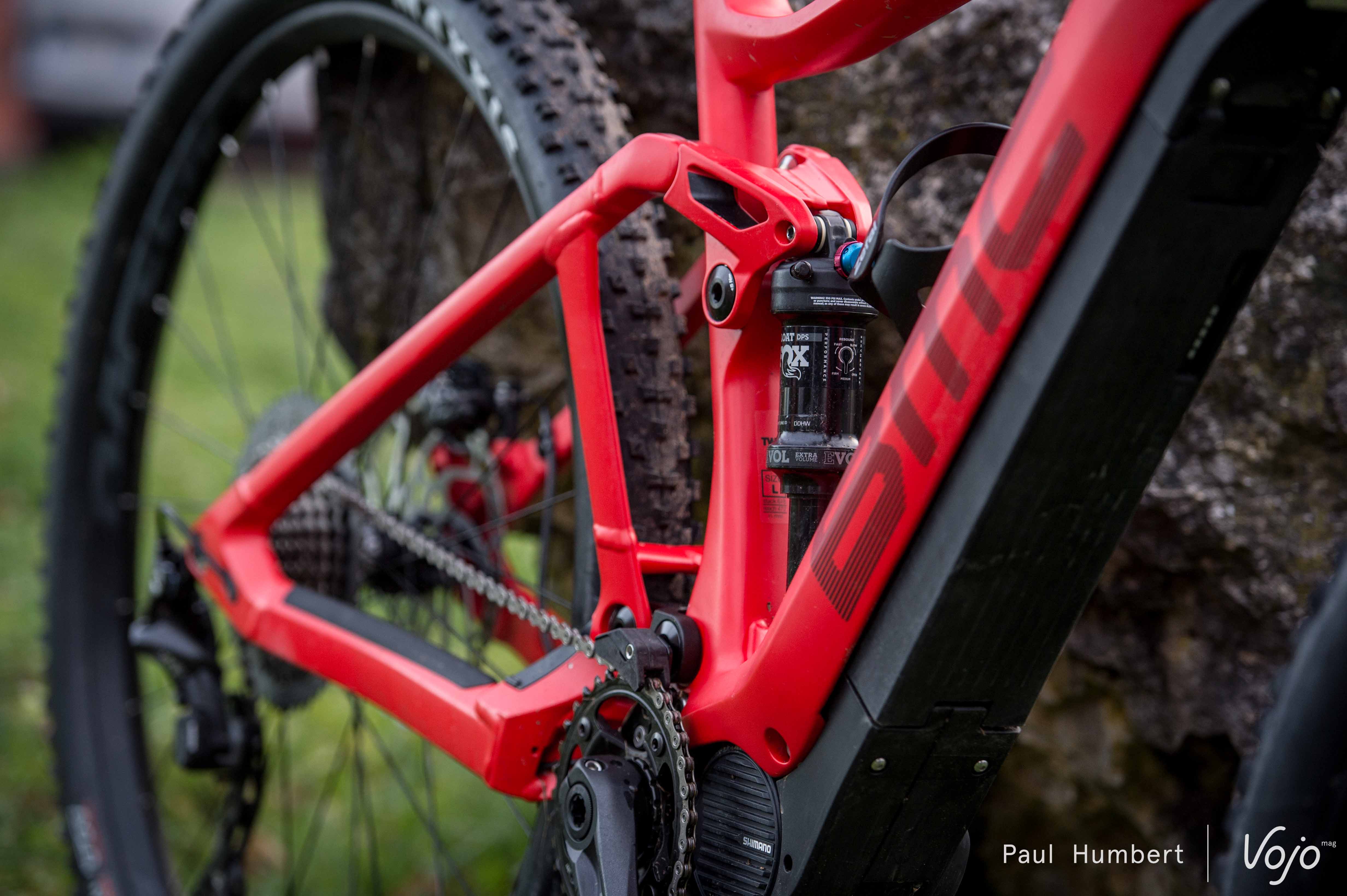 Côté construction, on retrouve un triangle avant en carbone dans lequel vient se dissimuler la batterie du moteur Shimano, et un triangle arrière en aluminium qui vient accueillir le capteur de vitesse. La suspension BMC baptisée « APS » a été affinée pour le Trailfox puis pour le Speedfox. On retrouve une biellette renforcée pour articuler le tout. Le moteur Shimano et la batterie sont protégés sous le tube inférieur.