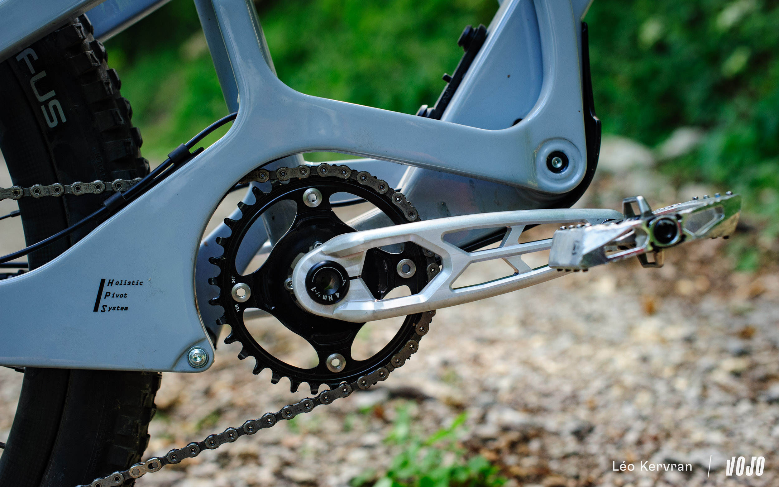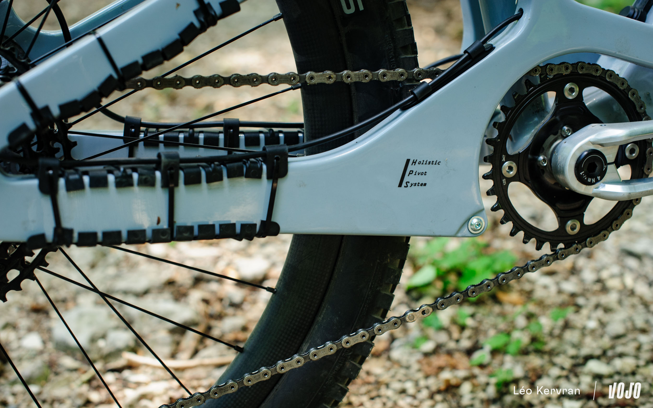 L’autre caractéristique du Race Horse, c’est bien sûr sa suspension Holistic Pivot System. Elle a été imaginée pour répondre à trois objectifs : une trajectoire de roue qui recule à l’impact, pas de kickback et de la simplicité, puisqu’il s’agit d’un monopivot en prise directe. Dominique Luce souhaitait en effet se passer de biellettes et de basculeurs dans la mesure du possible, des pièces qu’il juge peu fiables et sources de problèmes avec leurs nombreux axes.