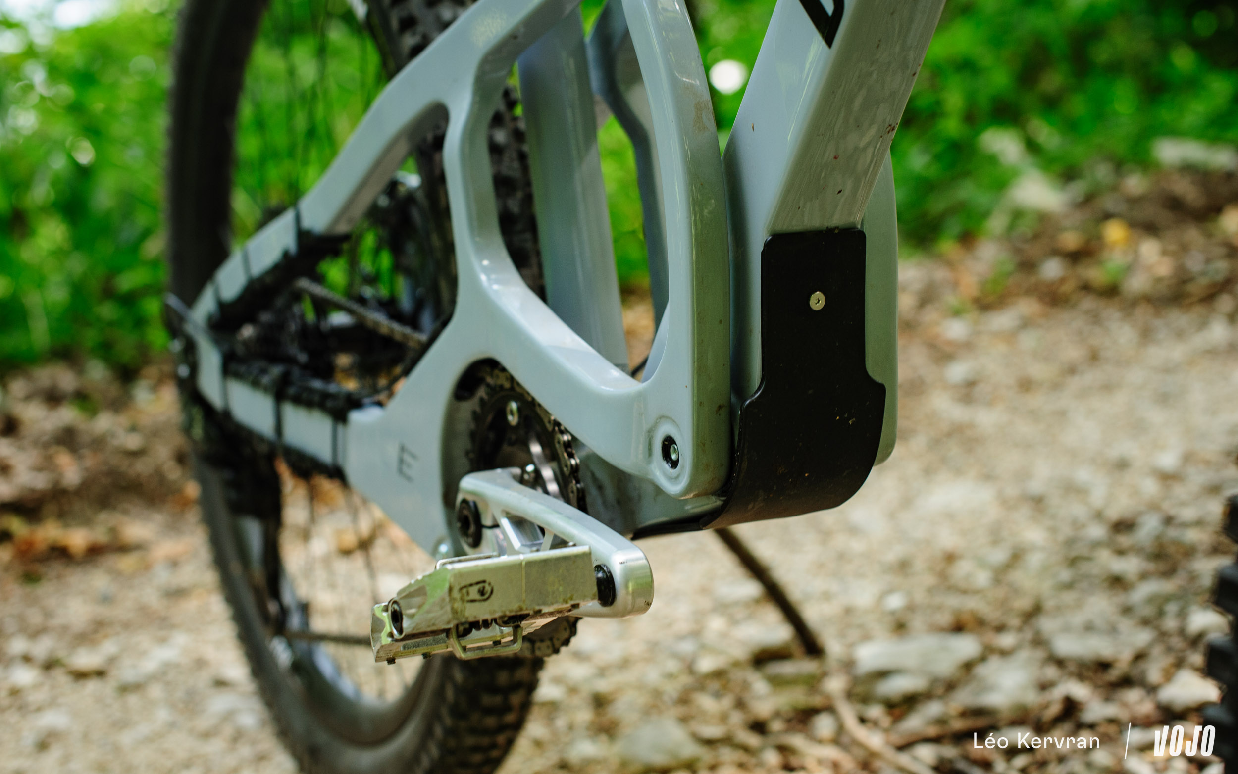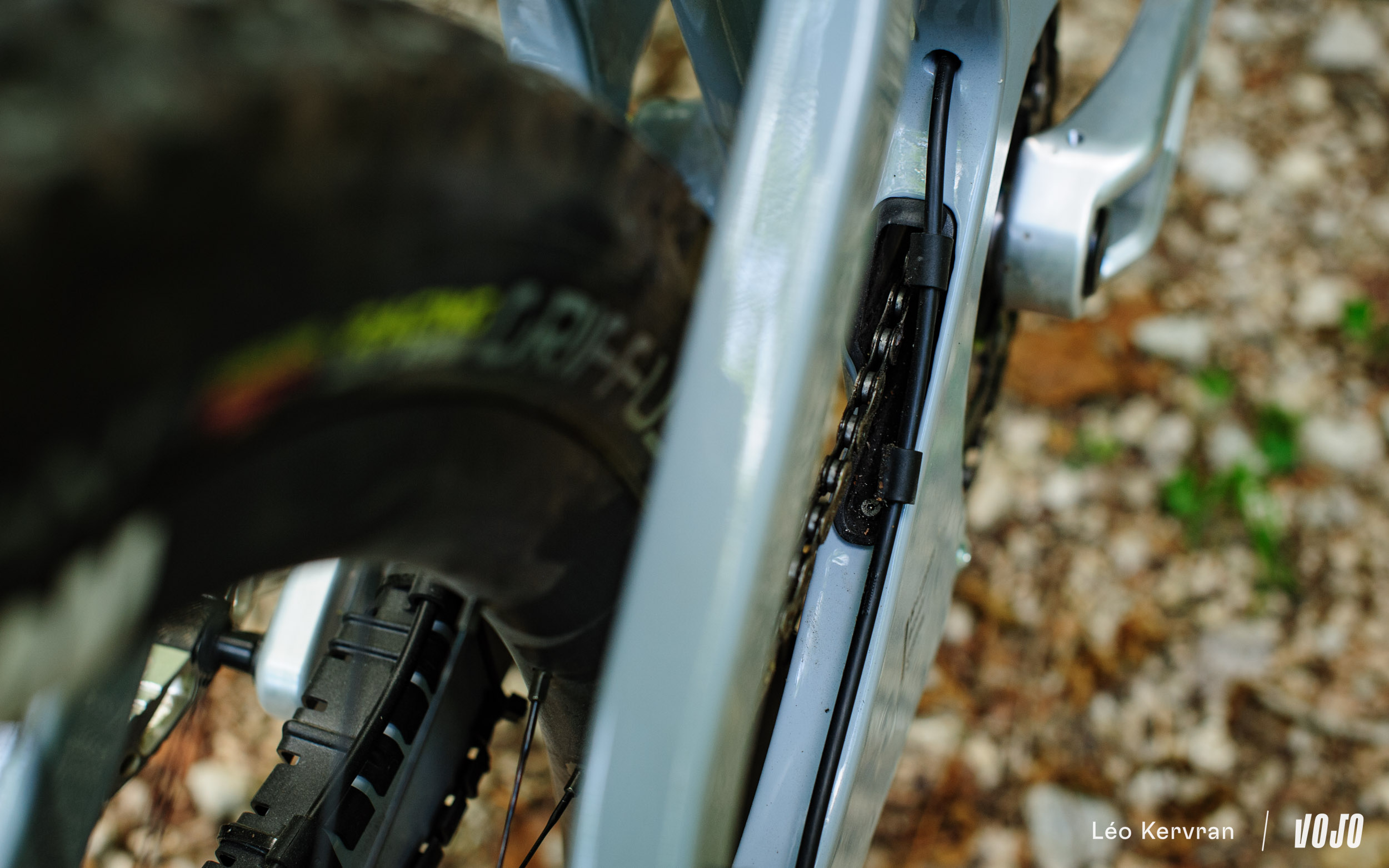 Dans les cailloux et les gros chocs ce n’était pas gênant outre mesure car on arrivait tout de même à rentrer dans le débattement, mais sur des sentiers plus en terre ou en poussière, on a senti qu’on perdait très facilement le grip sur la roue arrière. Toutefois, difficile de dire en une seule sortie si cela vient uniquement de ce tarage trop ferme ou si la gestion de la géométrie et du format hybride (27,5″ à l’arrière et 29″ à l’avant, la marque récuse le terme de « mulet ») est également en cause, voire le pneu arrière (un Hutchinson Griffus 2,4″ pas forcément le plus adapté aux conditions de l’essai).