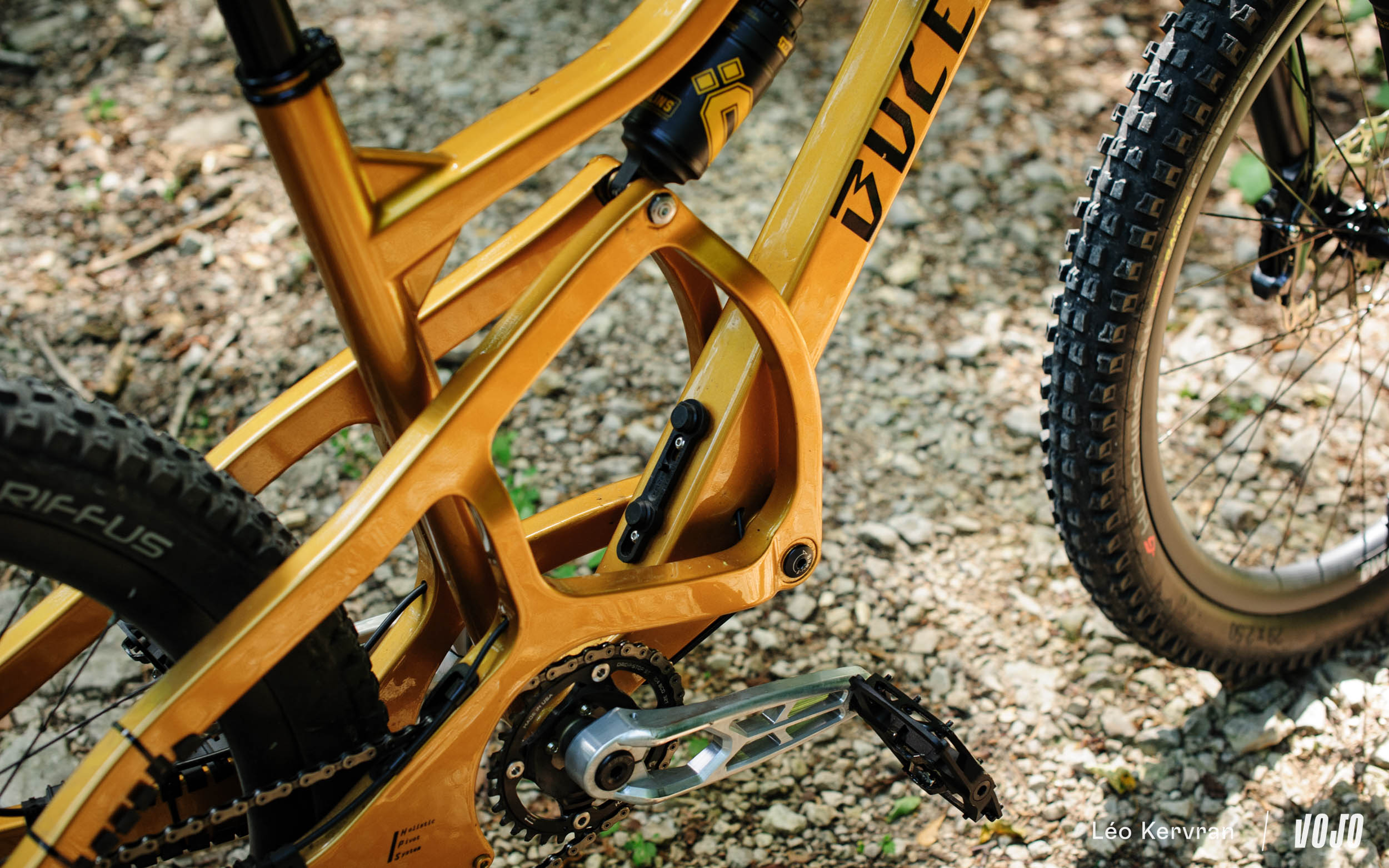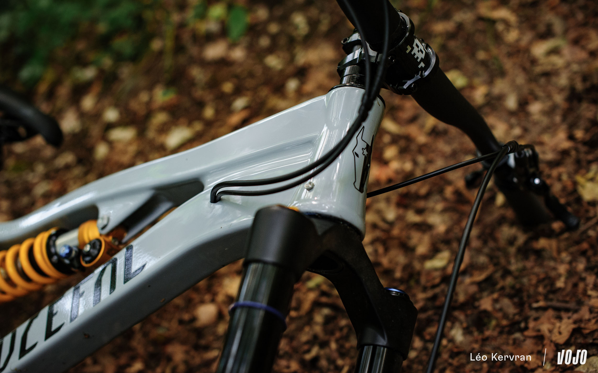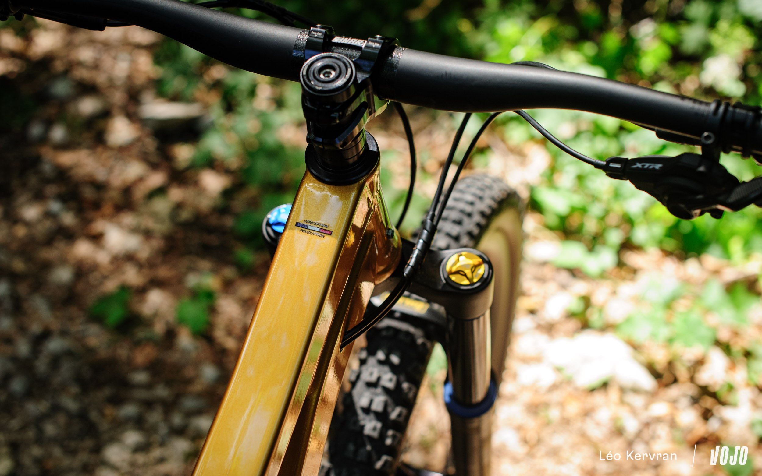 Et pourtant, cela s’est remarquablement bien passé. Il y a un véritable équilibre entre le débattement important (183 mm à l’arrière, 170 mm devant) et la géométrie plus sage (65° d’angle de direction, 464,5 mm de reach en taille L) et si on sent bien le côté « gros vélo » en s’installant sur la machine, on n’a pas non plus l’impression d’être sur un monster truck.