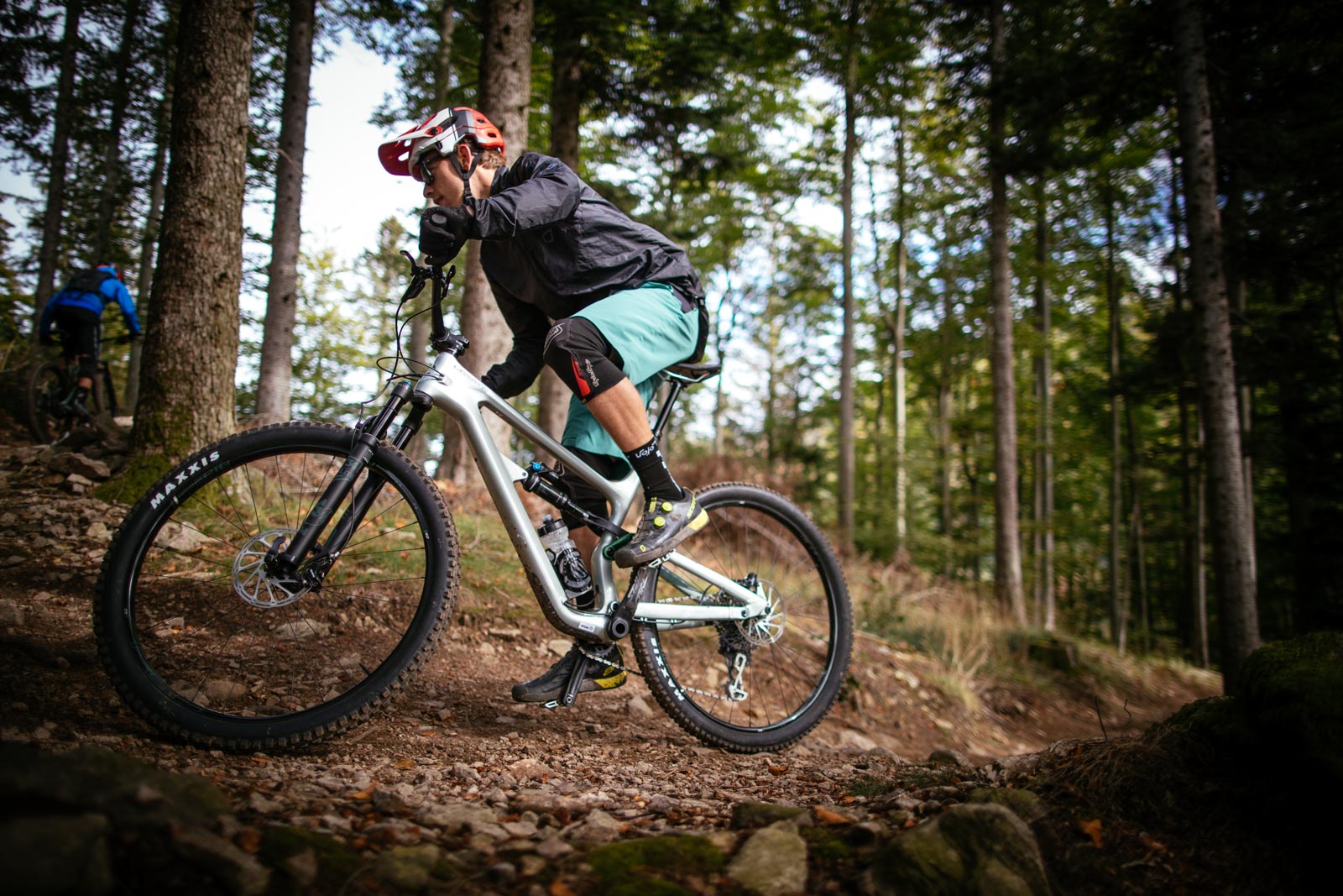 Du côté de la suspension, on apprécie le fait de rester assez haut et la progressivité dès le milieu de course, mais nous avons tout de même libéré un peu de pression en milieu de ride pour aller chercher plus d’assise et de débattement. Toujours bien active, la suspension offre une très belle lecture de terrain.