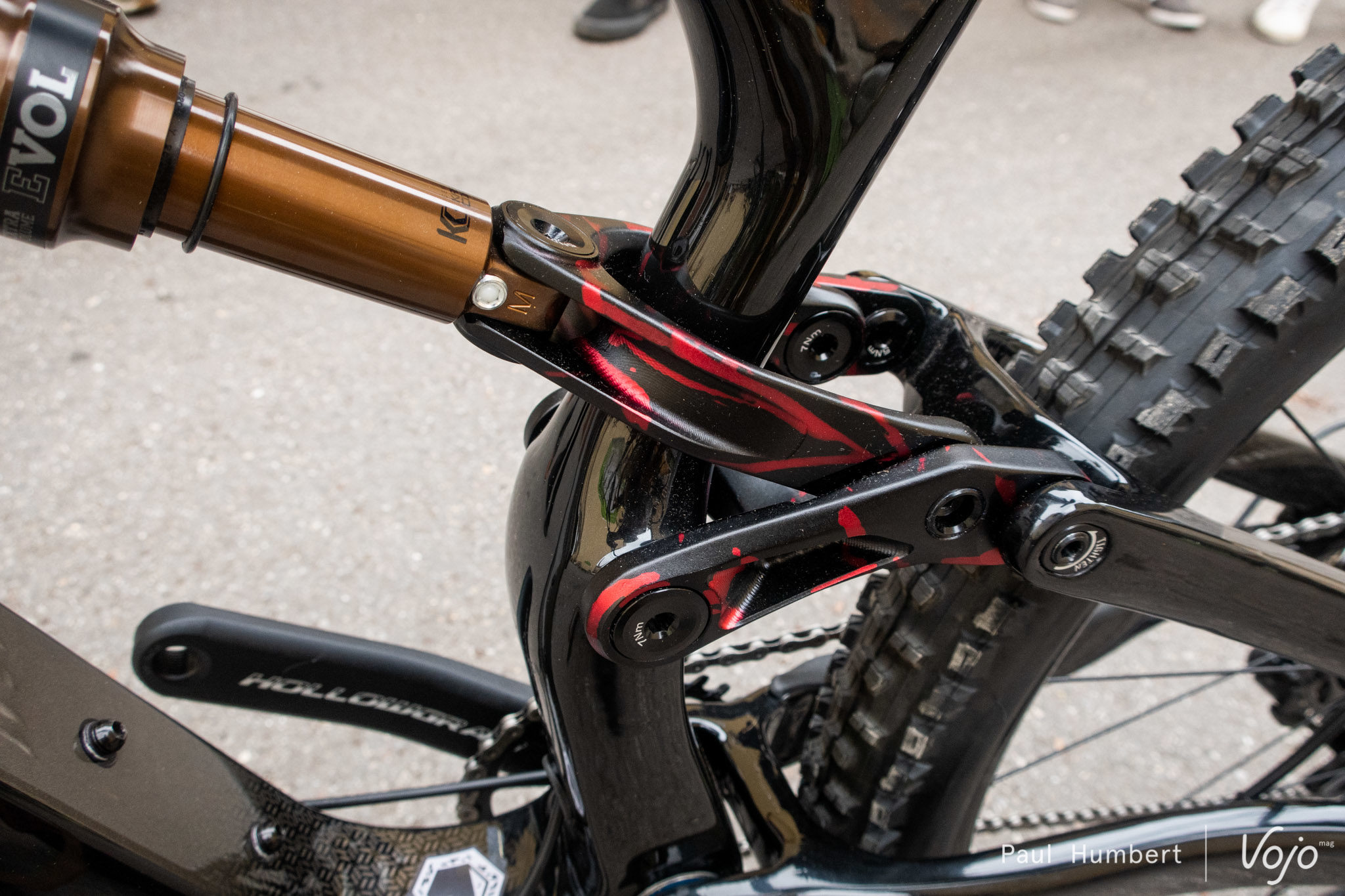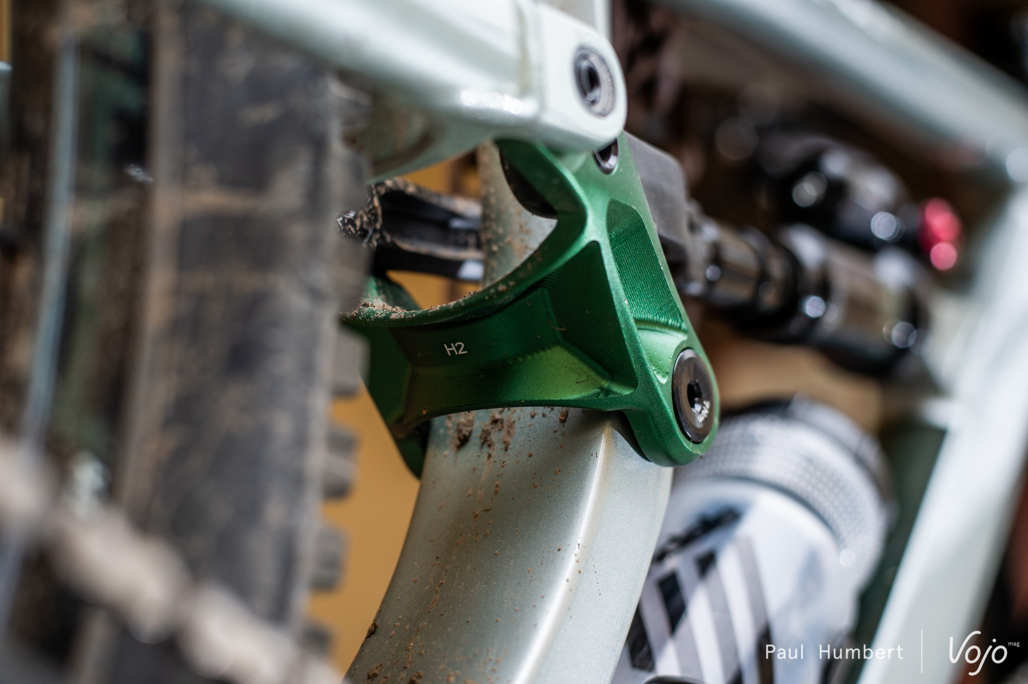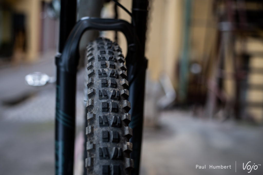 Le cadre peut accueillir des pneus jusqu’à une section 2,6. L’ensemble du vélo a été bodybuildé et on retrouve des freins 4 pistons et des pneus costauds.