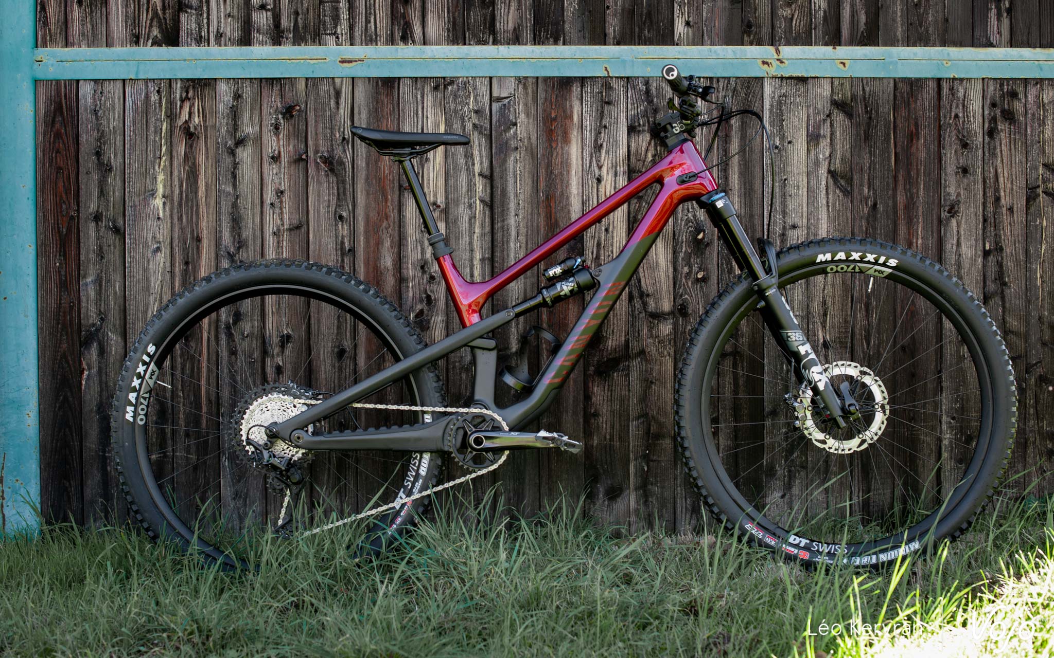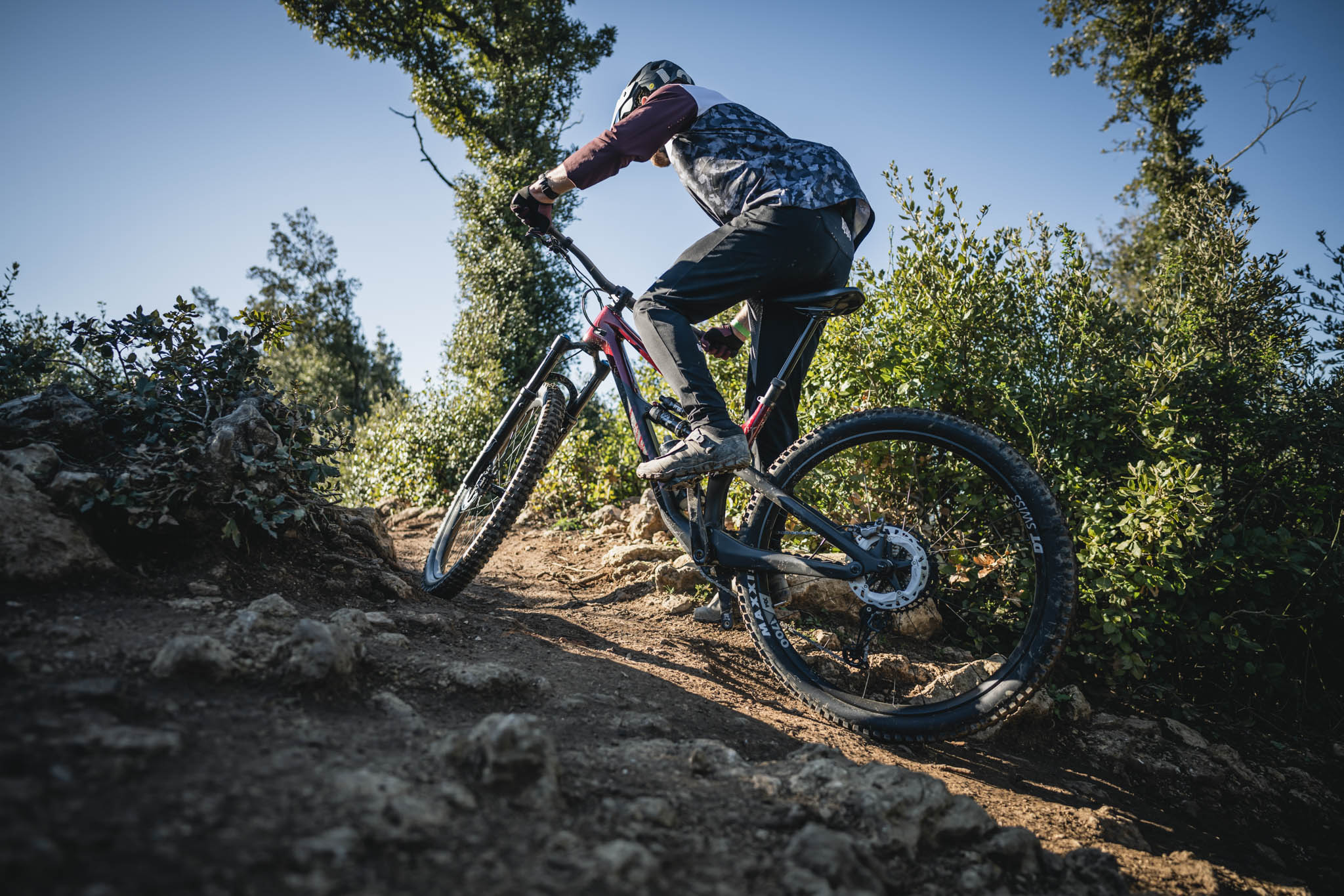En descente… C’est pareil, on roule comme en enduro ! Dès les premiers gros chocs le vélo fait oublier qu’il n’a « que » 125 mm de débattement à l’arrière, ça encaisse très très bien. La progressivité est telle qu’on a l’impression de ne jamais arriver au fond du débattement même si le témoin prouve que c’est bien le cas. Résultat, cela donne une sensation de réserve infinie très rassurante et qui invite à rouler toujours plus fort, un régal !