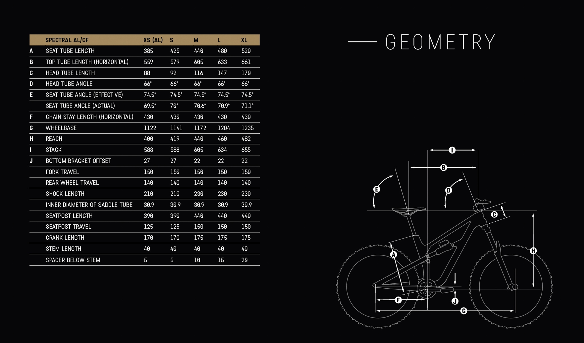 Le vélo offre une géométrie en phase avec son époque. Les bases sont courtes (430mm) et le triangle avant est relativement long. Le tout est fait pour offrir un compromis entre stabilité et caractère joueur. Le reach en taille M est de 440mm, l’angle de direction est de 66 degrés et celui du tube de selle est à 74,5 degrés. La géométrie du Spectral 2018 est pensée pour s’associer à une potence de 35mm et un cintre de 760mm de large.