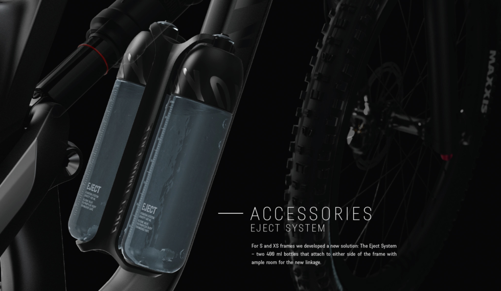 On retrouve un porte bidon latéral assez classique mais aussi, pour les tailles S et XS, un porte bidon « double » qui intègre deux petits réservoirs qui ont la faculté de na pas buter contre l’amortisseur. Malin !