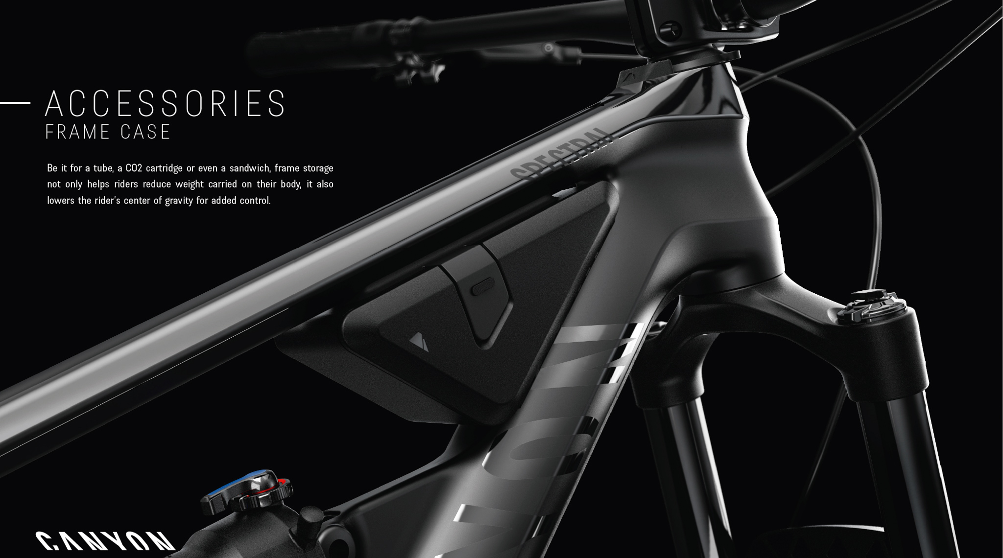 C’est ainsi que Canyon a conçu une pochette qui vient se fixer à l’avant du cadre grâce à des pas de vis (similaires à ceux d’un porte bidon). La solution d’intégration est intéressante mais il est probable qu’ajouter du poids aussi haut et loin du boitier de pédalier affecte légèrement le comportement du vélo si le chargement est lourd.