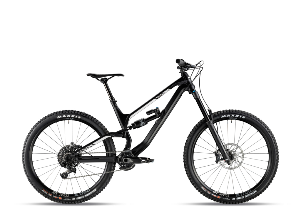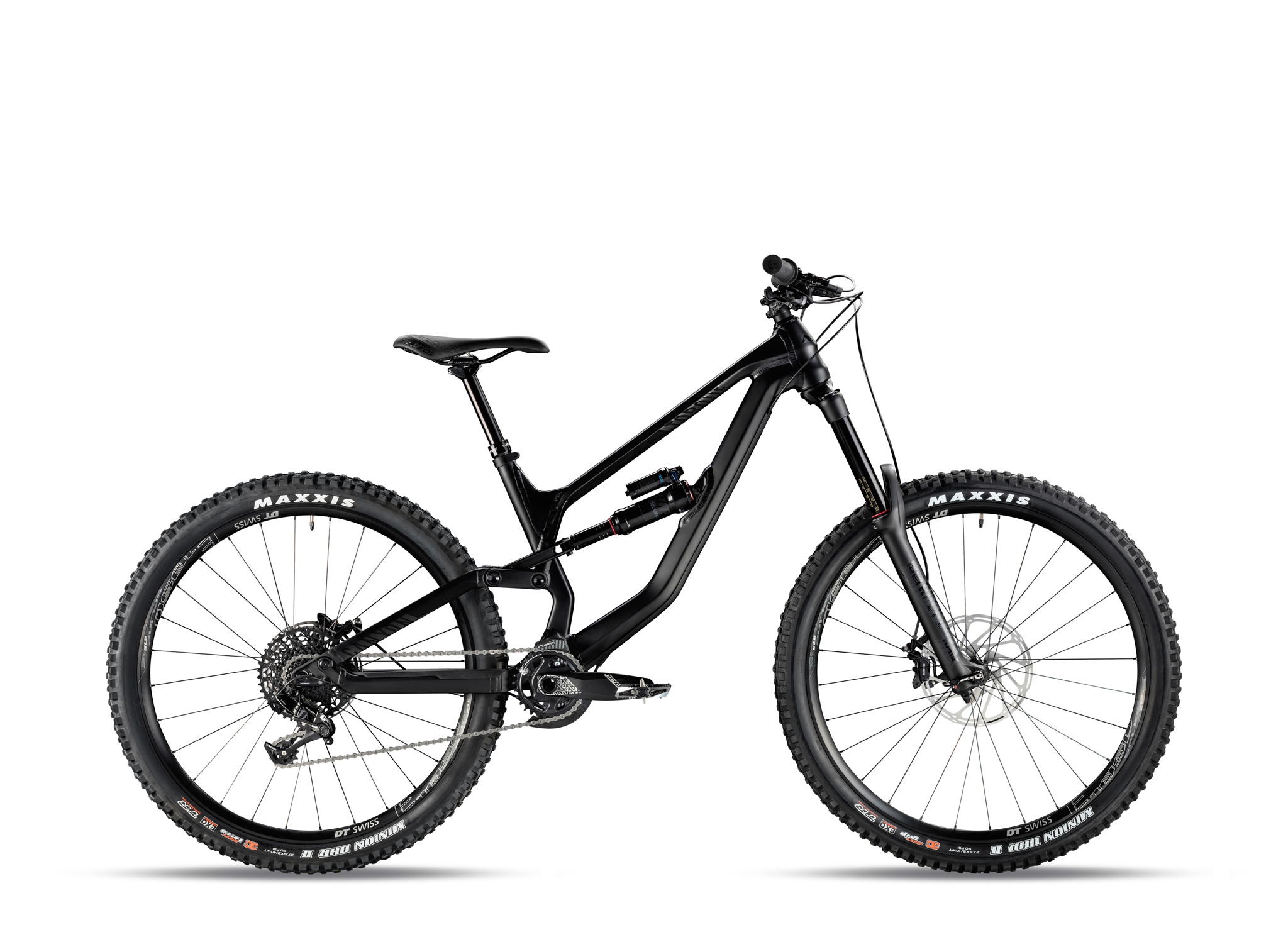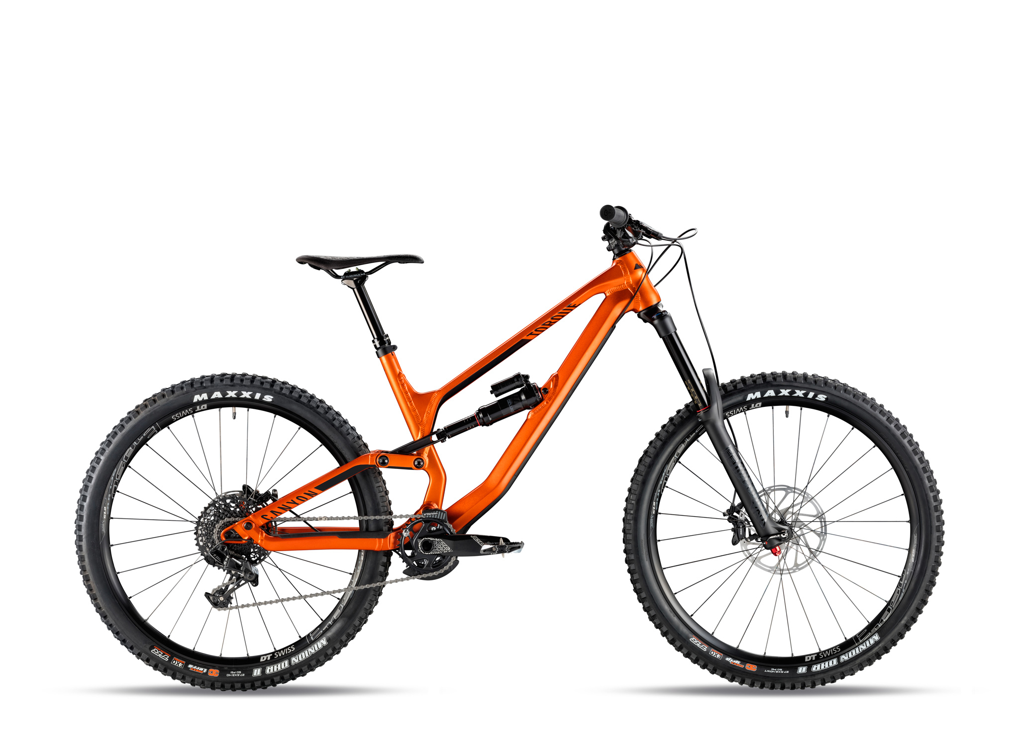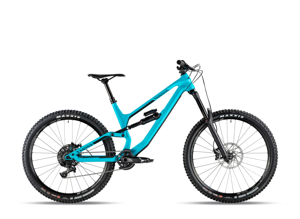 Un « gravity bike », voilà le programme. Le vélo est équipé de roues de 27,5 pouces, son débattement arrière est de 175mm et sa fourche en développe 180.