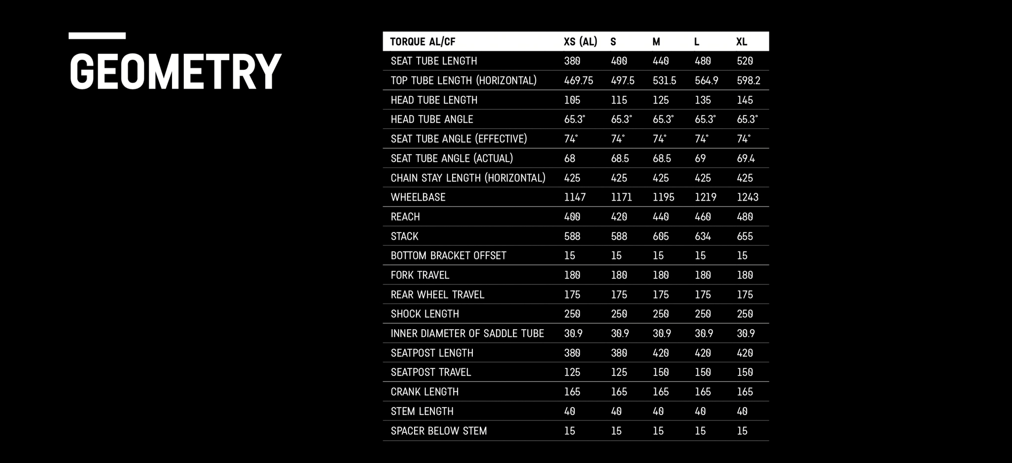 La géométrie du vélo le positionne à mi-chemin entre l’enduro et la descente, dans cette nébuleuse qu’on appelle «freeride ». Le Canyon Torque 2018 affiche un angle de direction de 65,3 degrés et des bases de 425mm de long. Le reach en taille M est de 440mm. Le vélo sera commercialisé en 5 tailles (XS, uniquement en aluminium, S, M, L et XL).