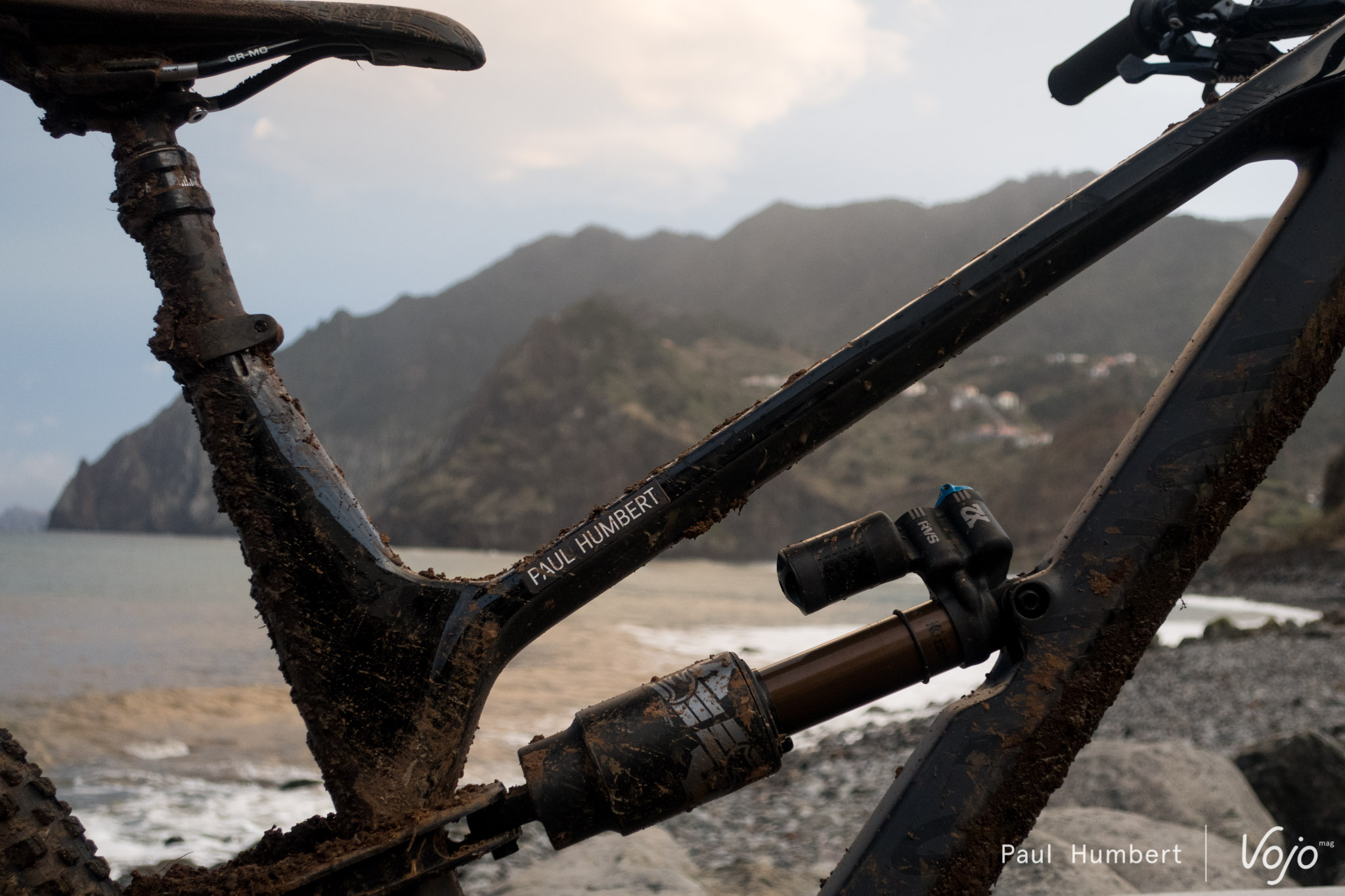 La courbe de la suspension induit une bonne lecture de terrain en tout début de course avant d’offrir une plateforme plus ferme à environ 30% de compression pour conserver un comportement joueur avant d’encaisser ensuite les plus gros chocs. Canyon encourage ses utilisateurs à utiliser des « tokens », des bagues, pour faire évoluer le volume d’air présent dans l’amortisseur et modifier la compression.