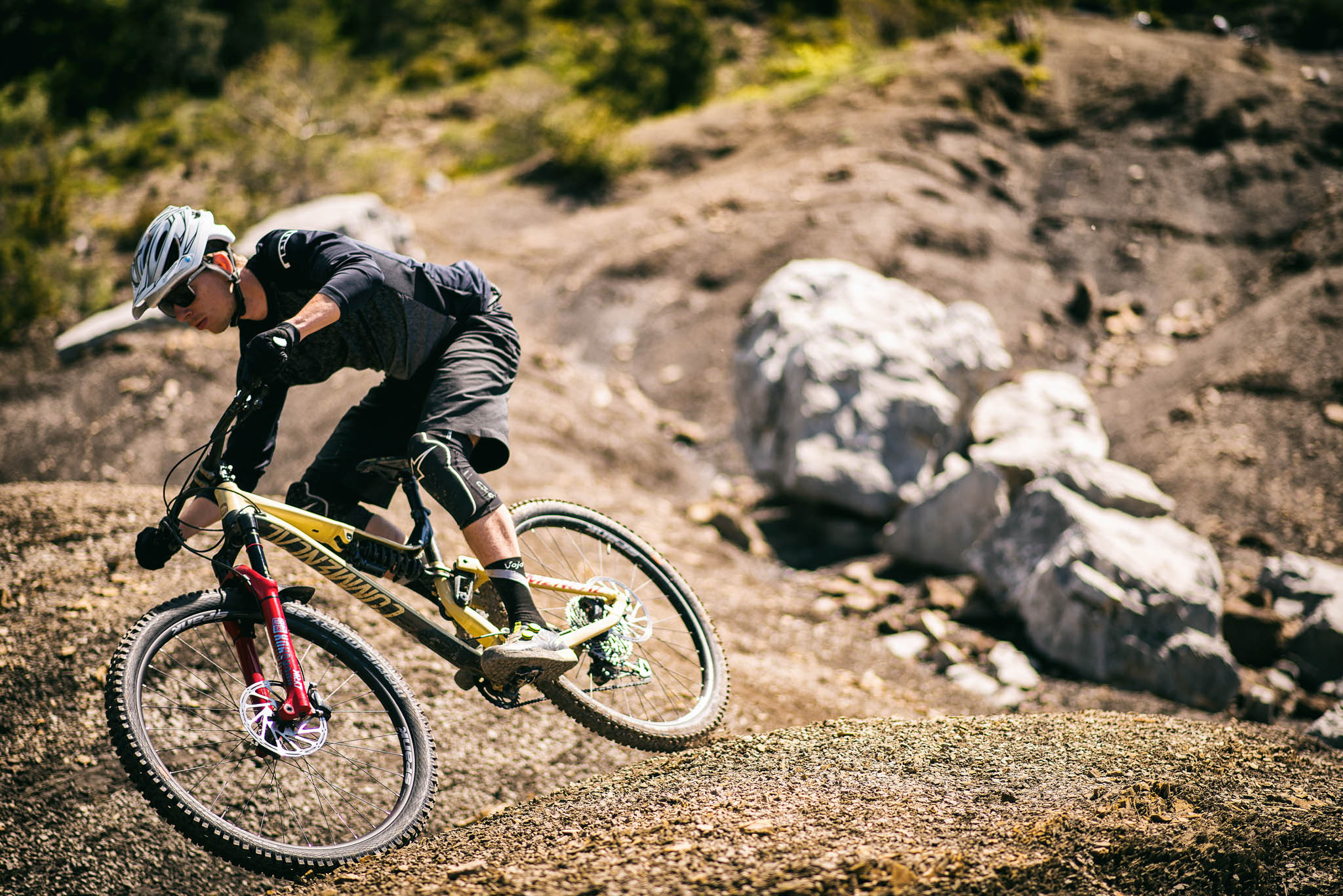 On se sent franchement en confiance sur la machine et si on se laisse aller à des passages bien engagés ou rapides, nous n’avons pas le sentiment d’avoir une machine exclusivement tournée vers ce genre de profil, comme ça peut être le cas avec le Trek Slash. Le vélo reste accessible et ludique sur des terrains plus lisses et roulants. Accessible, il le reste même pour des pilotes n’ayant pas un bagage technique et physique démentiels.