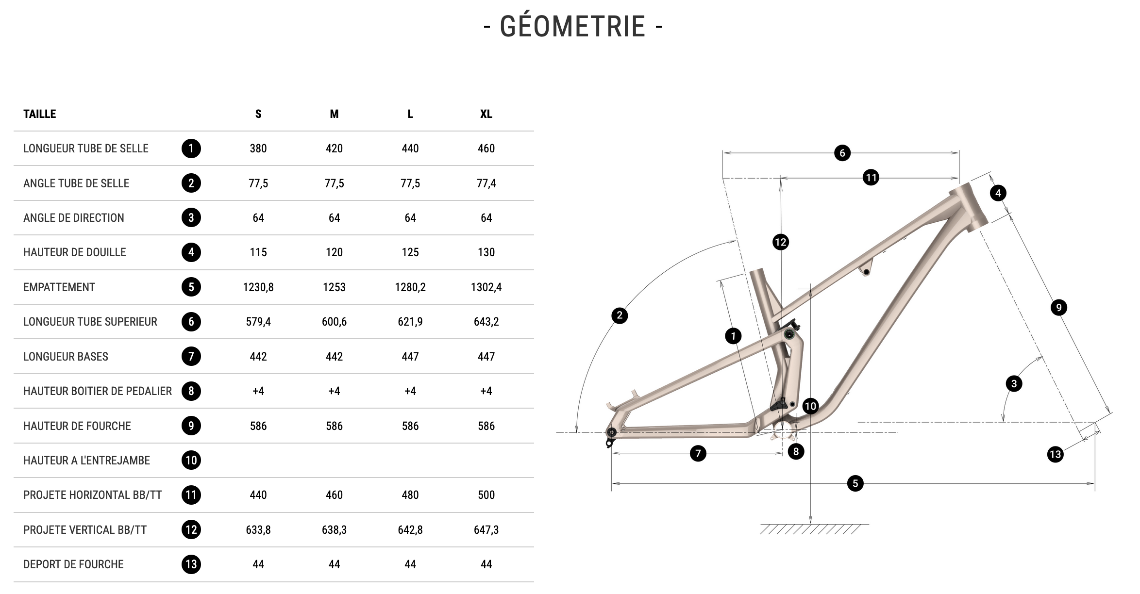 Côté géométrie, le modèle SX (en taille M, schéma de gauche) affiche un angle de direction de 64°, un reach de 460 mm, des bases de 442mm ainsi qu’un tube de selle de 77,5°. En comparaison, le Meta V5 « tout court », en taille M et position haute, a un angle de direction plus ouvert d’un demi degré (64,5°), un reach identique (460mm), des bases plus courtes de 25mm (435mm) et un angle de tube de selle plus redressé de 78,2°. En plus de ces différences de cotes, le Meta V5 est doté d’un flip-chip placé à la liaison entre l’amortisseur et la biellette, permettant de coucher un peu plus la géométrie si le besoin s’en fait sentir.