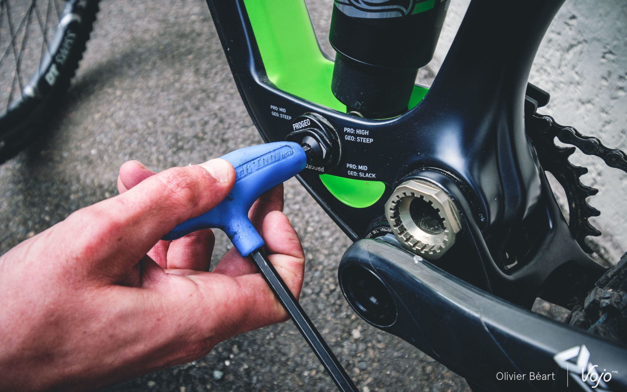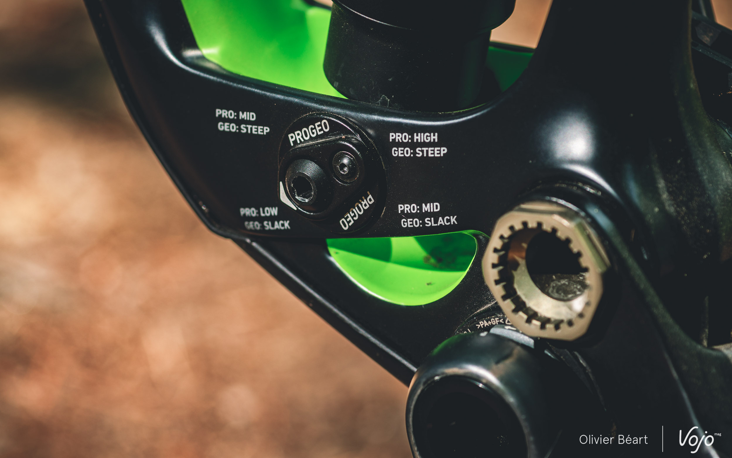 Avec une simple clé Allen, il est possible de choisir très facilement parmi quatre positions. Les modes “steep” ou “slack” influencent l’angle de direction, l’angle du tube de selle (1° de variation) et la hauteur du boîtier de pédalier (12mm de variation), et sont associés aux positions “low”, “mid” ou “high” qui concernent la gestion des chocs. On obtient ainsi quatre combinaisons, adaptées aux montées délicates, aux descentes rapides et fluides, aux trails techniques et sinueux ou encore aux descentes ponctuées de gros drops qui exigent une fin de course peu sensible au talonnement. Nous verrons plus loin ce que ça donne sur le terrain, mais on peut d’ores et déjà vous dire que la manœuvre est très facile à effectuer et ne prend réellement que quelques secondes sans qu’il y ait de risque de perdre la moindre pièce.