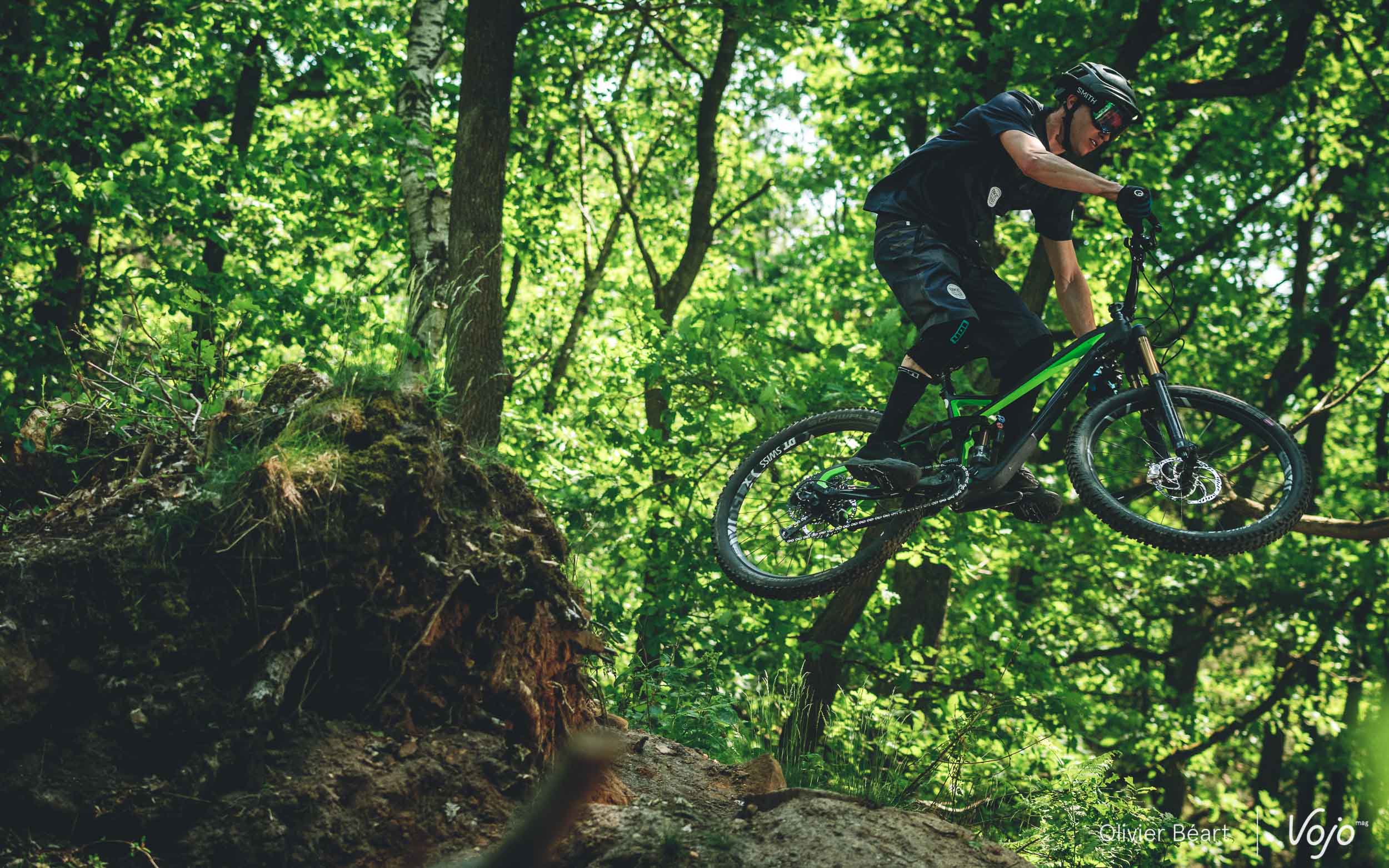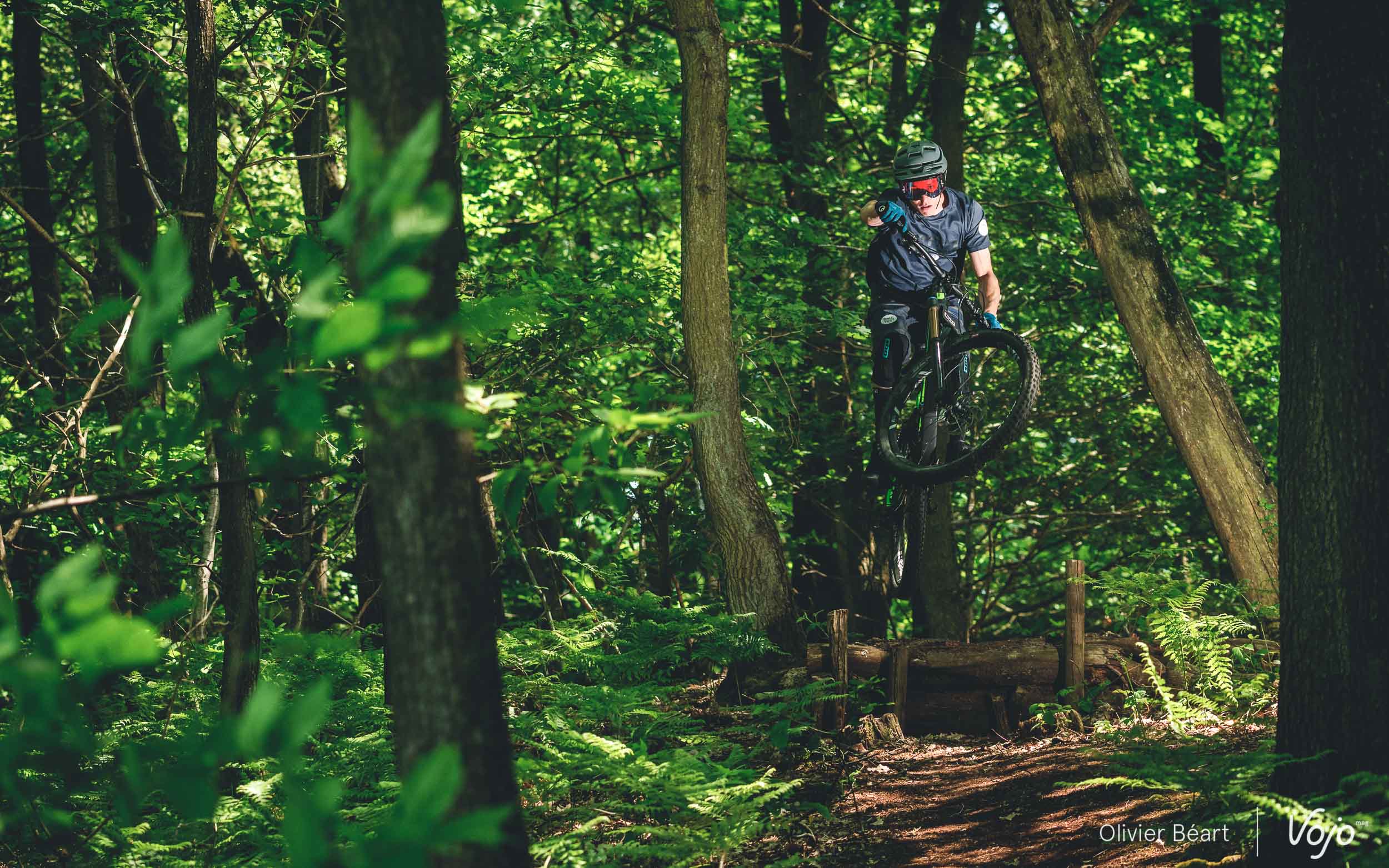 Ce qui ressort en premier lieu, c’est la facilité avec laquelle le vélo se prend en main. Malgré sa géométrie, si pas radicale, au moins assez typée, on comprend immédiatement le mode d’emploi pour bien attaquer dans les sentiers. Sa maniabilité est démoniaque, même en position low/slack (la plus radicale) sur le Progeo, et c’est un vrai jouet pour s’envoyer en l’air sur les sauts. Il donne la banane, et c’est déjà pas mal pour un début.