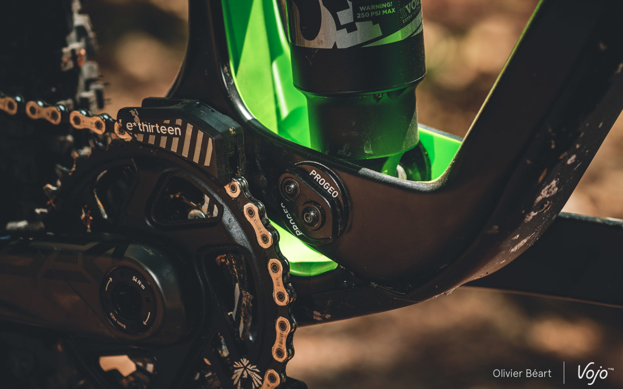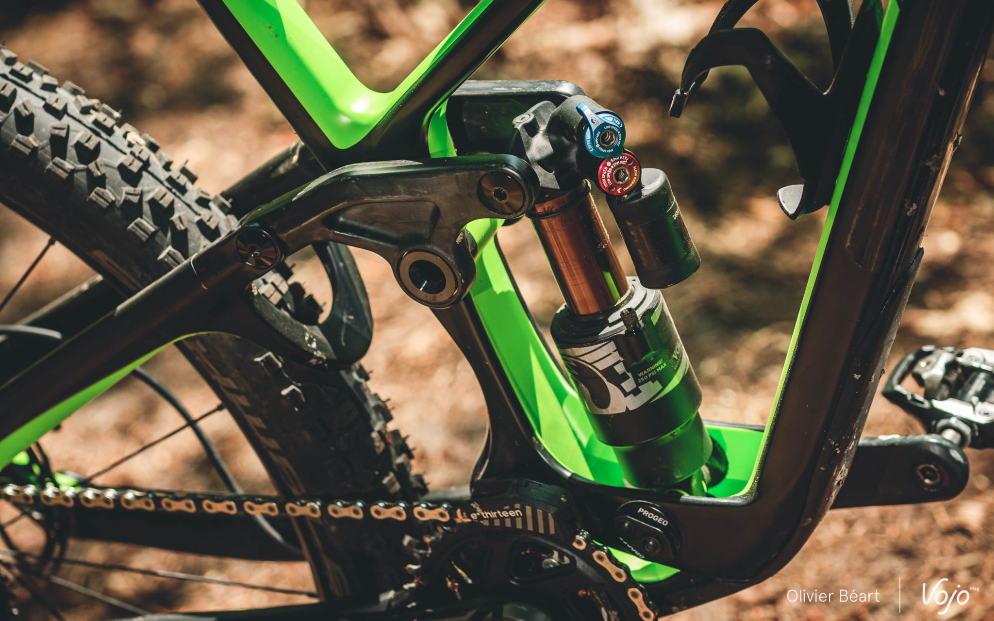 Sur les pistes assez lisses mais rapides et par moments engagées, le compromis de la géométrie slack (couchée) et de la suspension en mode intermédiaire nous semble le plus intéressant pour profiter de toutes les qualités du vélo. Pour bien faire, il faudrait revoir légèrement les réglages de l’amortisseur (quelques clics en rebond et compression, mais pas la pression), mais nous n’en avions hélas pas le temps et le vélo reste très cohérent sans chipoter aux molettes de réglages du X2 lorsqu’on passe d’une position à l’autre sur le Progeo.