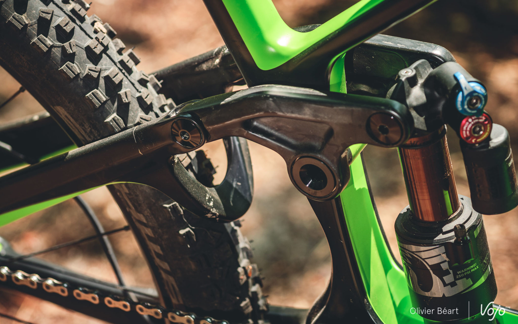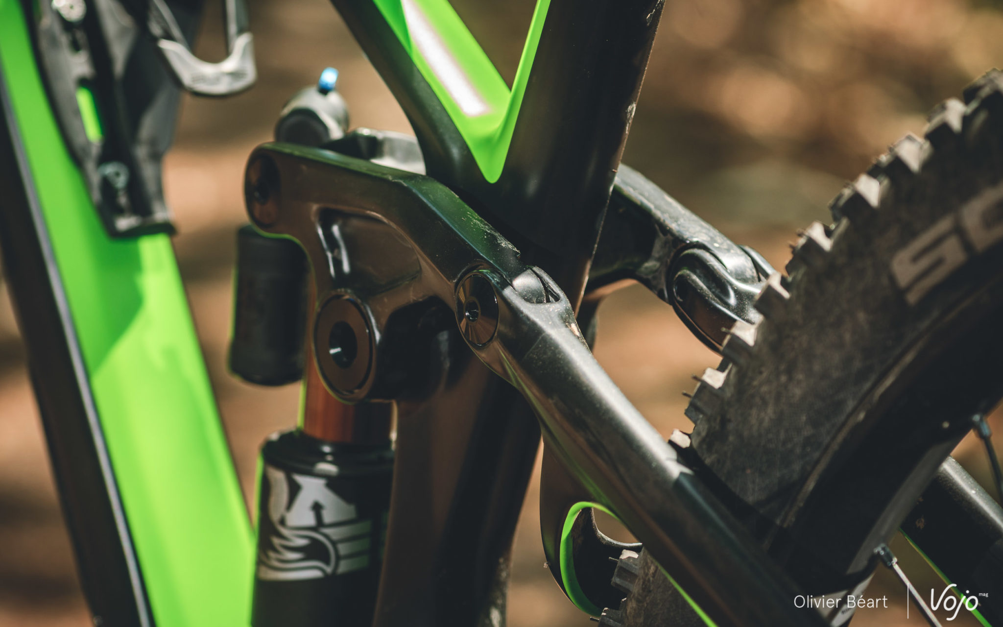 Parmi les détails qui attirent l’œil, il y a notamment cet important arceau de renfort entre les haubans, le fait que le cadre accepte sans souci un grand bidon même s’il est très sloping, et aussi la présence d’axes surdimensionnés au niveau de tous les points de pivot, ainsi que le fait qu’ils se (dé)montent au moyen d’un simple outil pour cassette. Bien vu !