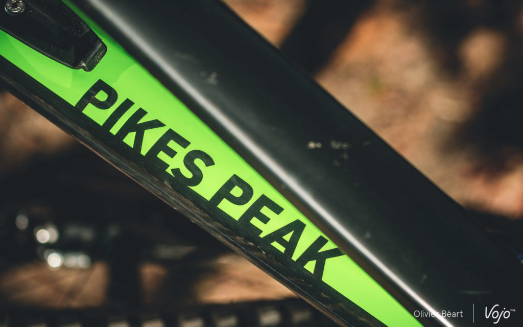 Au niveau de la géométrie, le Pikes Peak se montre très contemporain et on peut même dire qu’il taille assez grand avec un reach de 445/455 en taille M (selon position du Progeo), le tout combiné à une potence très petite, en 32mm de long seulement. Les bases sont courtes avec 430mm, l’angle de direction bien couché (65,6° en mode low, 66,5 en high) et le tube de selle assez redressé pour garder de bonnes facultés au pédalage (74/75°).