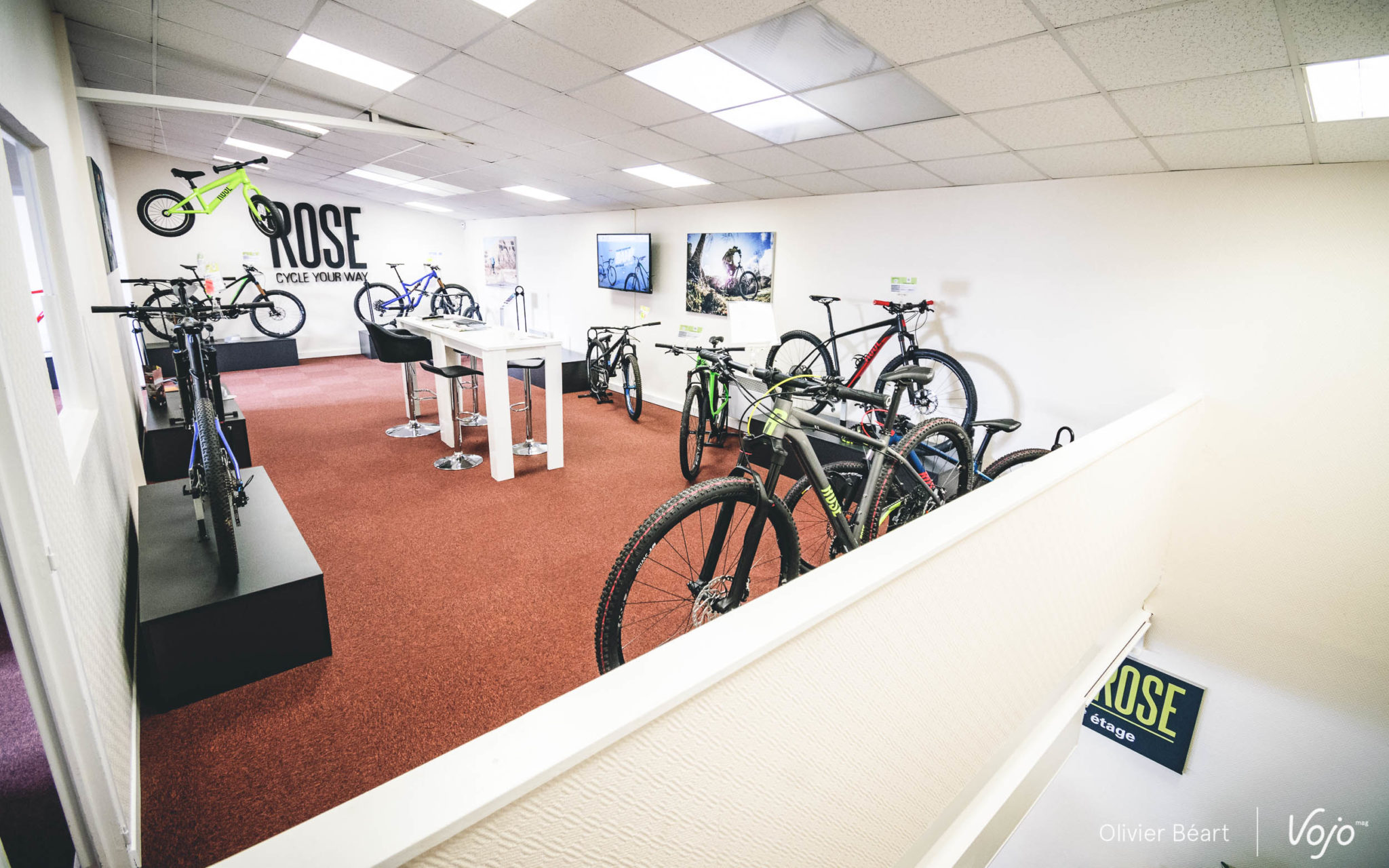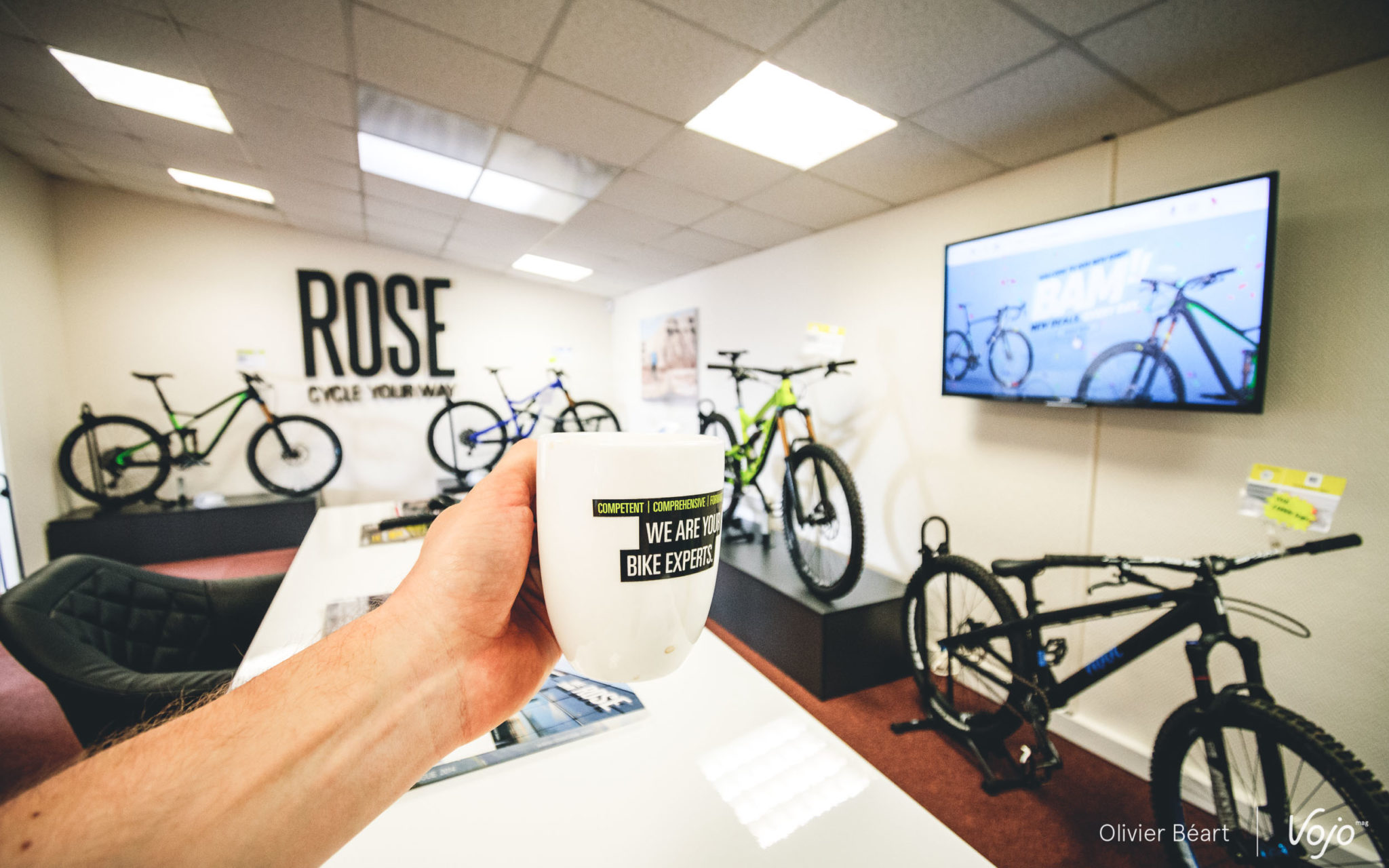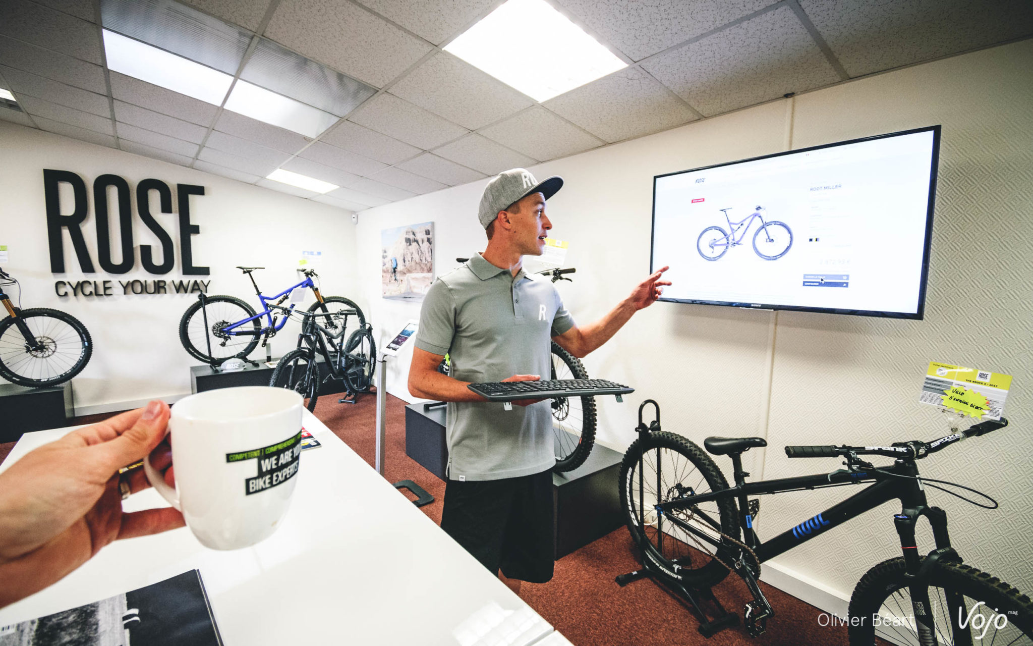 Ici, nous avions déjà une idée assez précise de ce que nous voulions tester, mais si ce n’est pas le cas, Florian peut vous guider à travers les modèles de la marque et vous montrer les configurations possibles sur le site de Rose. Car les Allemands se distinguent en proposant de très nombreuses options sur leurs vélos et il est possible de s’écarter très fort de la configuration de base si on le souhaite, ou juste de changer l’un ou l’autre composant (freins, pneus,…) avec ou sans supplément selon ses choix et le modèle de base sélectionné.