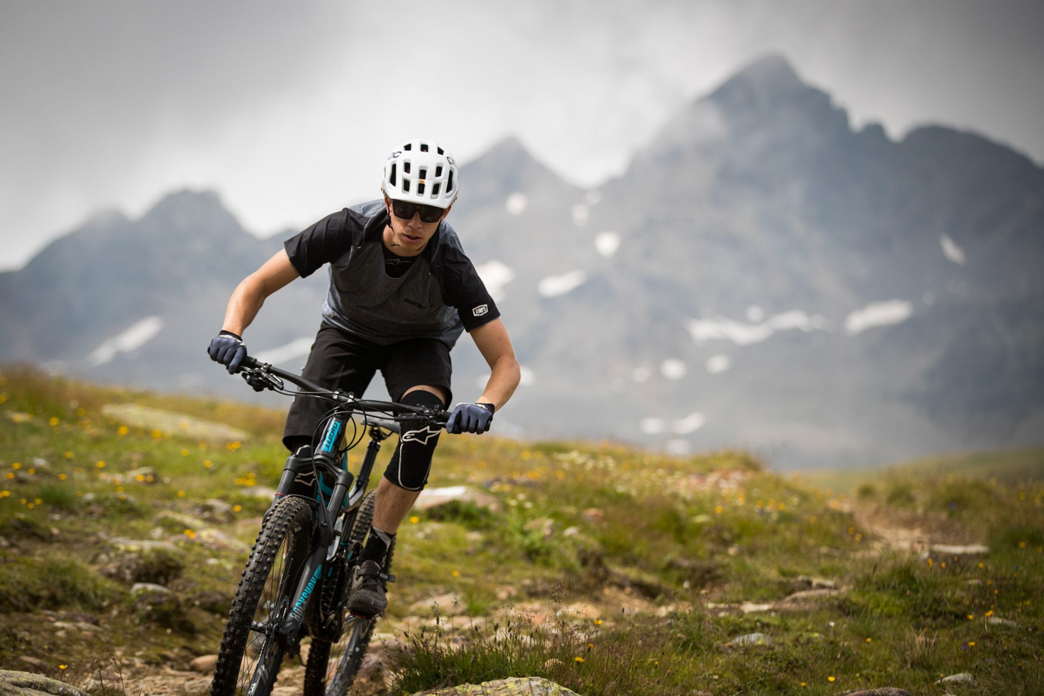 Mes premiers tours de roues se font sur un single alpin rocheux et vallonné. On enchaîne les petites montées, les pierriers et les premiers virages. Une chose est déjà certaine, le vélo grimpe bien pour une machine de ce calibre. Comme on pouvait s’y attendre, le Giant Reign 2018 est long de l’avant et un temps d’adaptation est nécessaire.