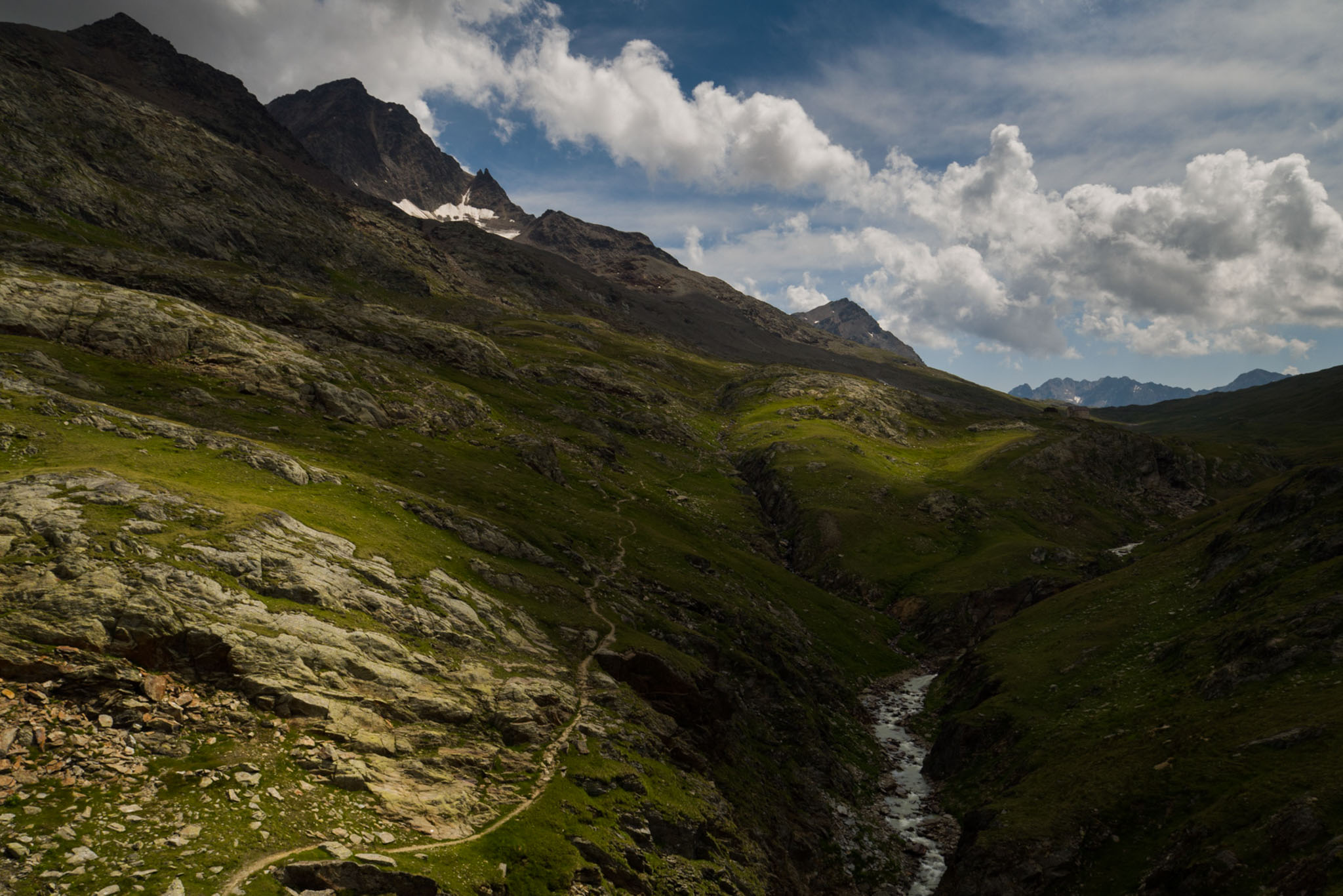 Inaccessible par les grands chemins, nos partons du bord d’un lac de montagne, entre ce qu’il reste de la neige de l’hiver et de gros blocs rocheux, pour une magnifique descente de plusieurs kilomètres.