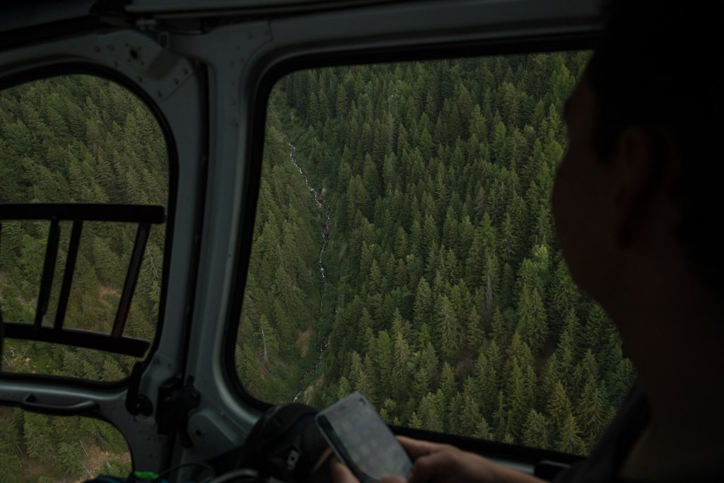 Le programme de notre découverte était relativement mystérieux jusqu’à notre arrivée. C’est finalement par les airs, une quinzaine de vélos pendant dans le vide, que nous avons atteint le point le plus haut de notre ride. On ne vous mentira pas, ce genre de dépose en hélicoptère est tout sauf déplaisant mais cela correspond assez peu à notre vision du VTT et de l’impact qu’on souhaite avoir sur l’environnement qui nous entoure.