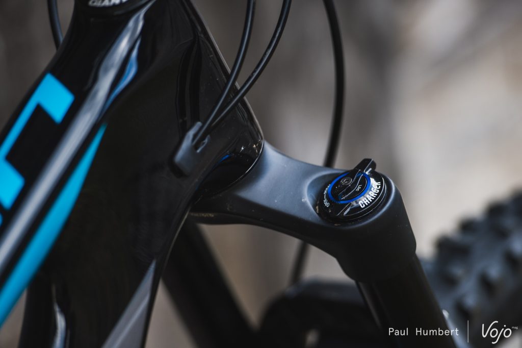 Cette monte d’amortisseur permet également de dégager plus d’espace pour de grandes tiges de selle télescopiques. Notre modèle de test en taille L était équipé d’une tige de selle de 120mm de débattement mais on nous annonce que les débattements varieront en fonction des tailles sur les modèles définitifs. Une nouvelle cartouche équipe la tige de selle Giant et deux commandes seront disponibles. Nous avons pu découvrir celle nécessitant une pression par le dessus.