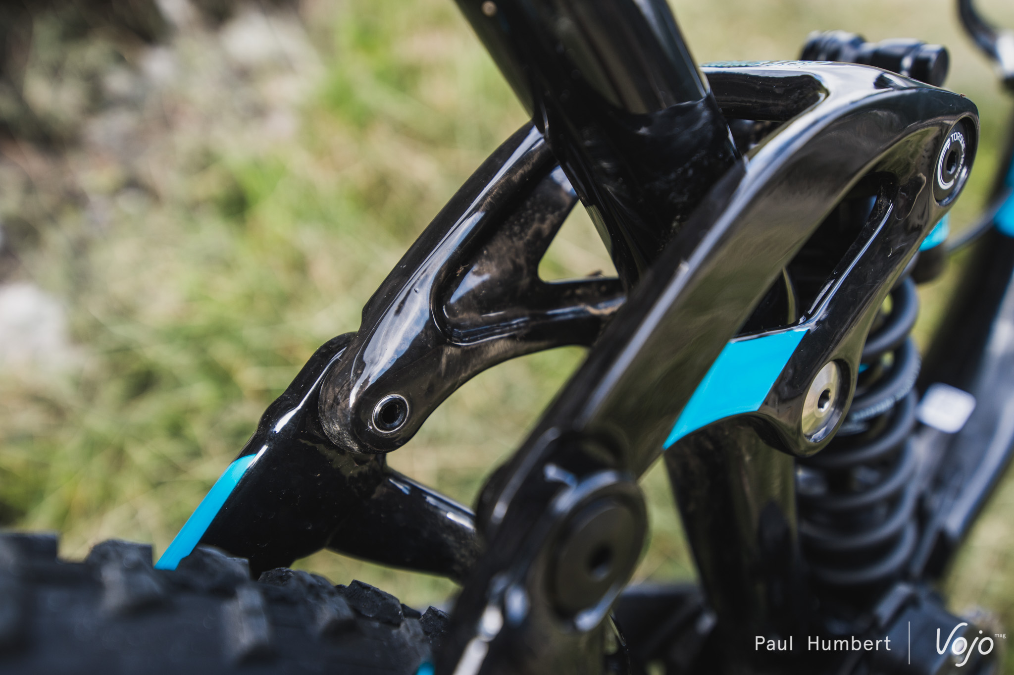 Sur cette version 2018 du Giant Reign, la biellette haute n’est plus construite en aluminium, mais en carbone, afin d’offrir une plus grande rigidité tout en gagnant un petit peu de poids.