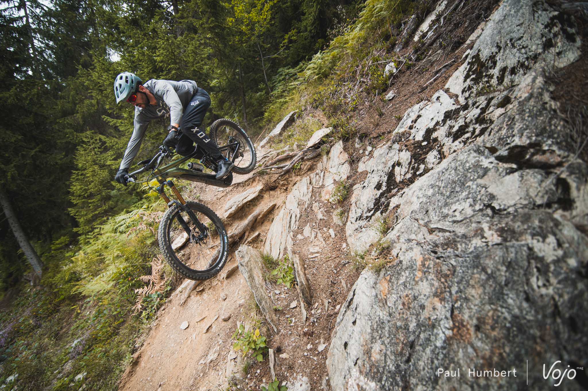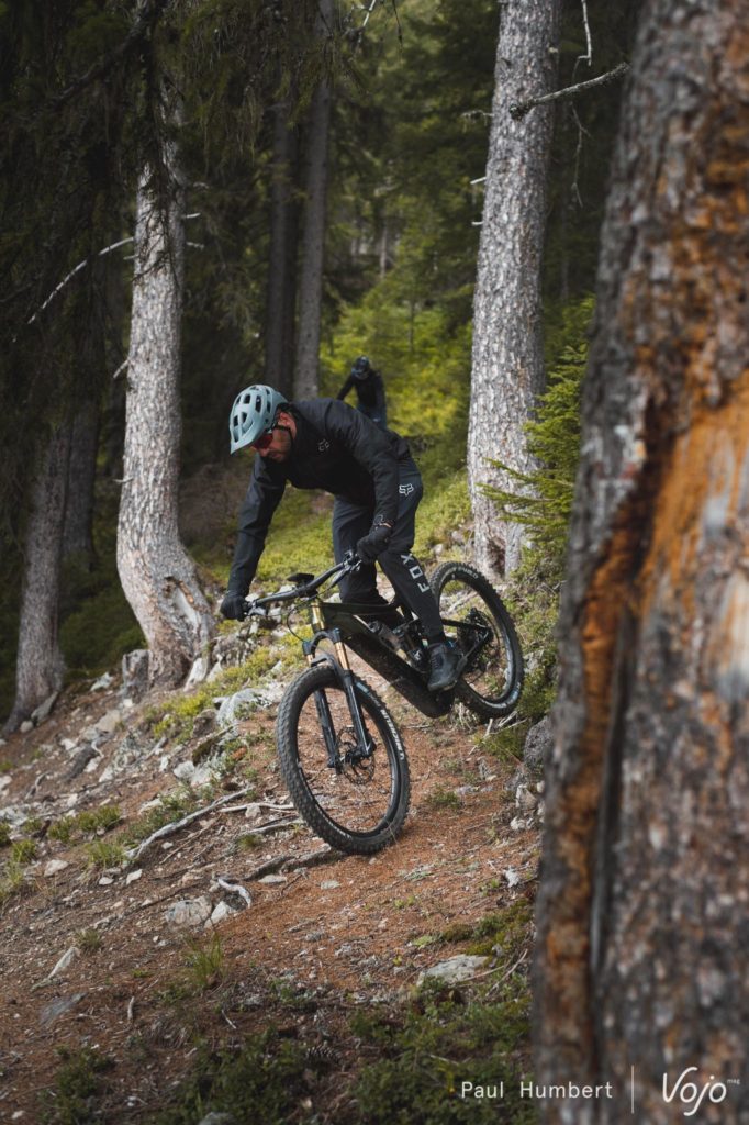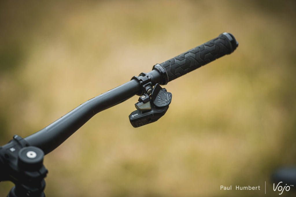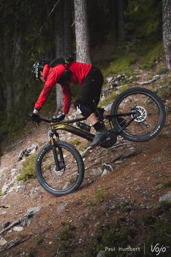 En parlant de roues, celles en carbone de notre modèle d’essai sont très rigides. Un peu trop rigide même, dans la mesure où il faut être particulièrement précis pour tenir ses trajectoires. Ces roues pourraient avoir du sens sur un 29″ pour rigidifier un peu l’ensemble mais ici, ça ne fait que rendre le vélo plus exclusif. Une paire de roues en aluminium aurait probablement offert un peu plus de tolérance, notamment sur des sections exigeantes comme les dévers.