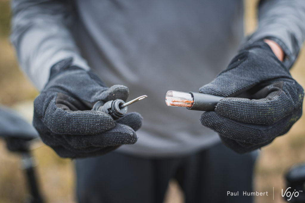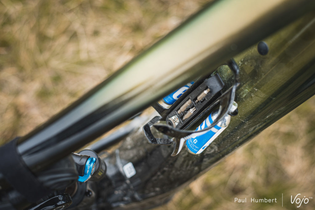 On terminera avec un point sur la gamme d’accessoires Giant, qui se développe de plus en plus avec des solutions intelligentes : nos modèles d’essais étaient ainsi équipés de mèches tubeless dans le cintre (les « containers » peuvent contenir jusqu’à 6 mèches d’un côté et un maillon rapide de l’autre) et de porte-bidons avec un petit multi-outils qui se loge discrètement au-dessus des vis.