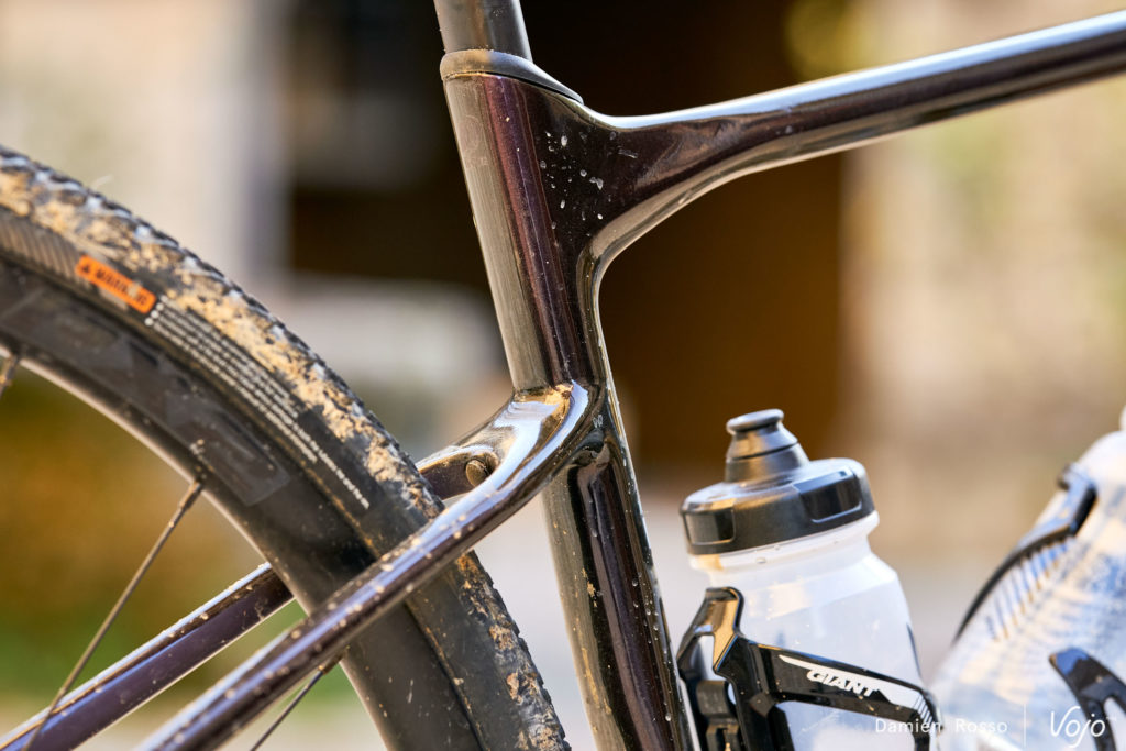 Le tube de selle mérite aussi qu’on s’y attarde. Tout d’abord, on note que les haubans se raccordent au tube de selle assez bas, pour créer une zone de déformation et offrir plus de confort au cadre. Ensuite, la forme du tube de selle est très particulière. Giant la nomme « DFuse », un nom doublement bien choisi, puisque la tige de selle spécifique a une forme de « D », et son rôle est de diffuser les vibrations et les impacts. Aplatie sur l’arrière, elle peut se déformer sur plusieurs millimètres pour offrir du confort. Et ça marche !
