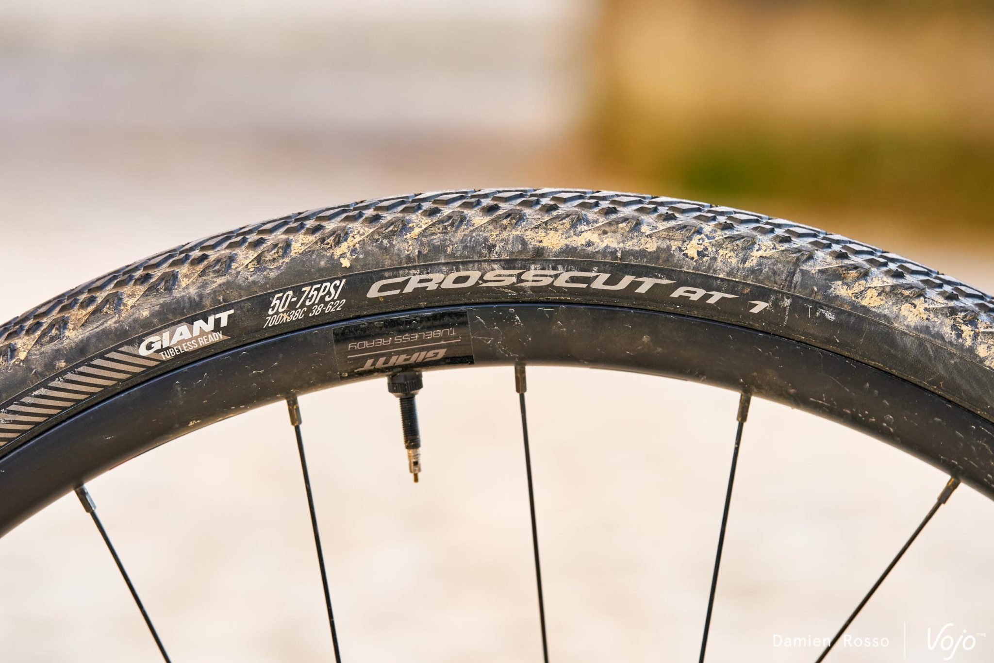 Côté équipements, notre version Advanced 2 est montée en transmission Shimano GRX, avec le haut de gamme 810 mécanique pour les dérailleurs et du RX600/400 pour les leviers et étriers de freins. Le tout est combiné à un pédalier Praxxis à la finition très soignée, qui s’intègre parfaitement au look du vélo. Giant a fait le choix – pertinent selon nous – du double plateau avec dentures 48/32 et cassette 11/34 à l’arrière. De quoi avoir une réelle polyvalence grâce à une large plage de rapports sans avoir de trop gros trous entre chaque vitesse.
