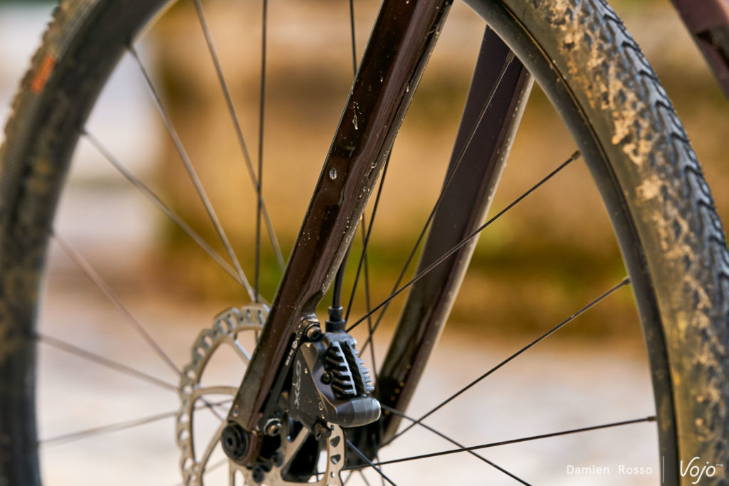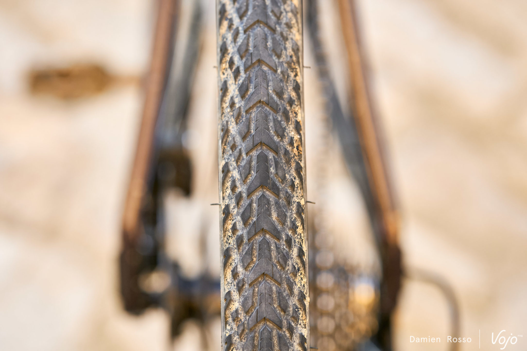 Les roues et pneus sont « maison », avec des jantes alu de 21mm de large , montées avec des pneus Crosscut de 38mm de section. Le cadre accepte des pneus jusque 45mm de section et si vous voulez un conseil de pièce à changer rapidement, ne vous privez pas de passer sur des pneus plus larges et plus haut de gamme. Comme nous le verrons plus loin, les Crosscut ont l’avantage d’être solides, mais pour le reste, on trouve plus raffiné ailleurs. Par contre, les roues sont très agréables et, même si elles ne sont pas des plus légères, elles ne pénalisent pas trop le vélo en rendement, et leur comportement est admirable hors asphalte.