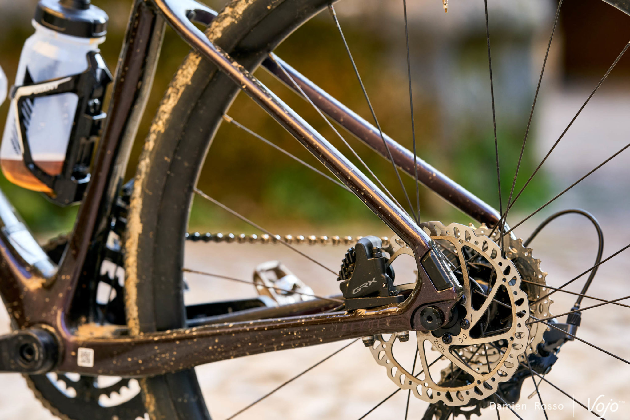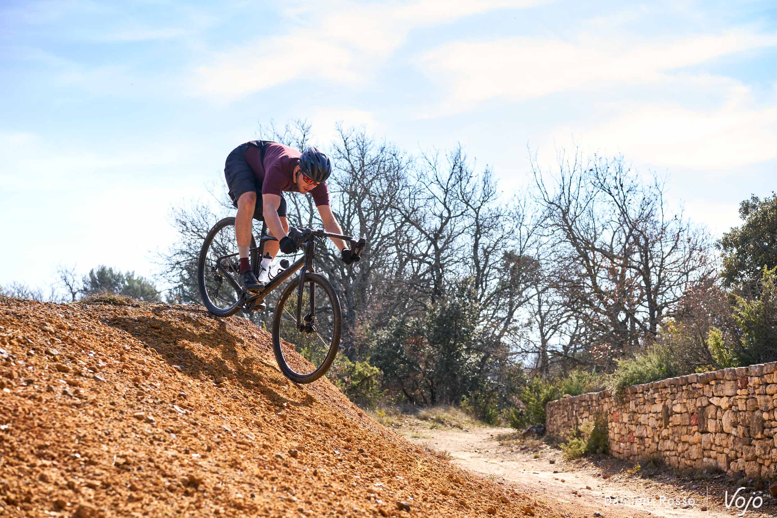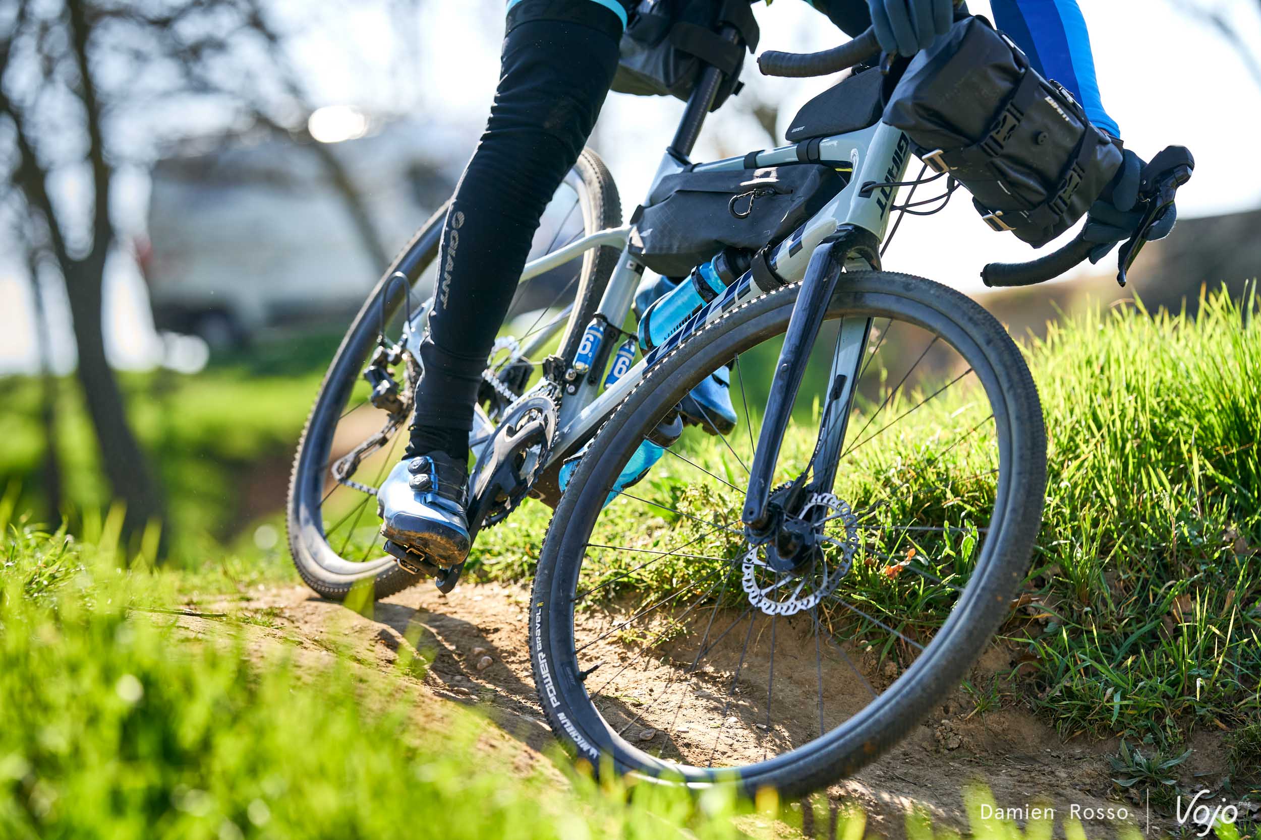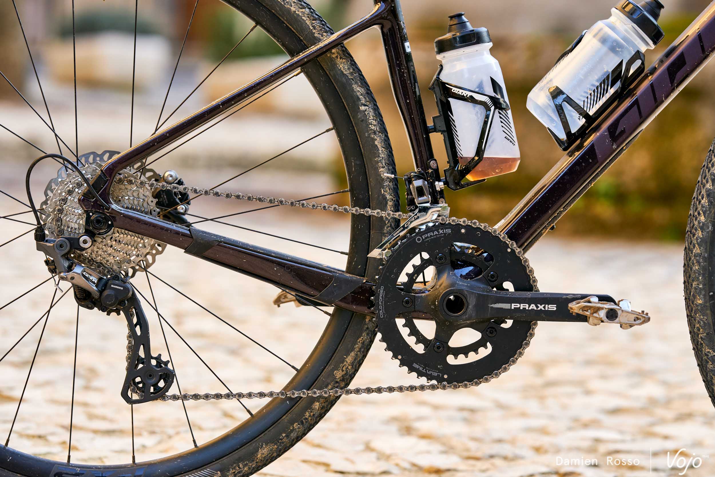 Pour le reste des équipements, les roues nous ont beaucoup plu en usage off-road grâce à une rigidité bien dosée qui leur permet d’être très tolérantes, dans le même esprit que le cadre. L’efficacité du groupe Shimano GRX n’est plus à démontrer. La transmission se fait de suite oublier, et les freins sont d’une grande efficacité. Quant aux poignées, on apprécie toujours autant leur dessin qui permet une excellente prise en main et qui participe à la facilité de contrôle de la machine. Mention très bien aussi pour le pédalier Praxxis, original, valorisant et qui procure des changements de rapports souples. A ce propos, nous avons vraiment apprécié d’avoir un double plateau, qui reste selon nous le meilleur choix en gravel pour avoir la plus grande polyvalence possible tout en évitant les trop grands écarts entre les rapports. Au final, à part les pneus, il n’y a rien d’urgent à changer et seul un upgrade des roues pour un modèle plus haut de gamme en carbone semble pouvoir apporter un plus significatif sur cette machine par ailleurs déjà équipée très intelligemment pour son prix.