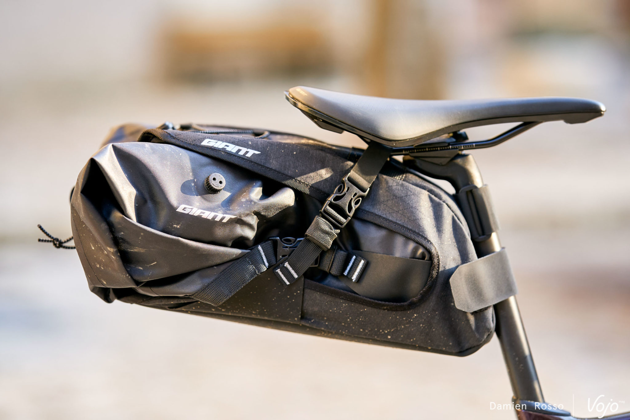 Un dernier mot sur le chargement : le vélo est prévu pour accueillir de la bagagerie tant au niveau de la fourche que sur le triangle arrière, avec des points d’ancrage. C’est assez peu commun sur un cadre carbone de cette trempe. Pour notre part, nous avons choisi un montage plus simple et léger avec juste une sacoche (issue du catalogue Giant) sous la selle, suffisante pour emporter des affaires pour deux jours. Vous pouvez découvrir les différents bagages Giant ici : https://www.giant-bicycles.com/fr/bagagerie.