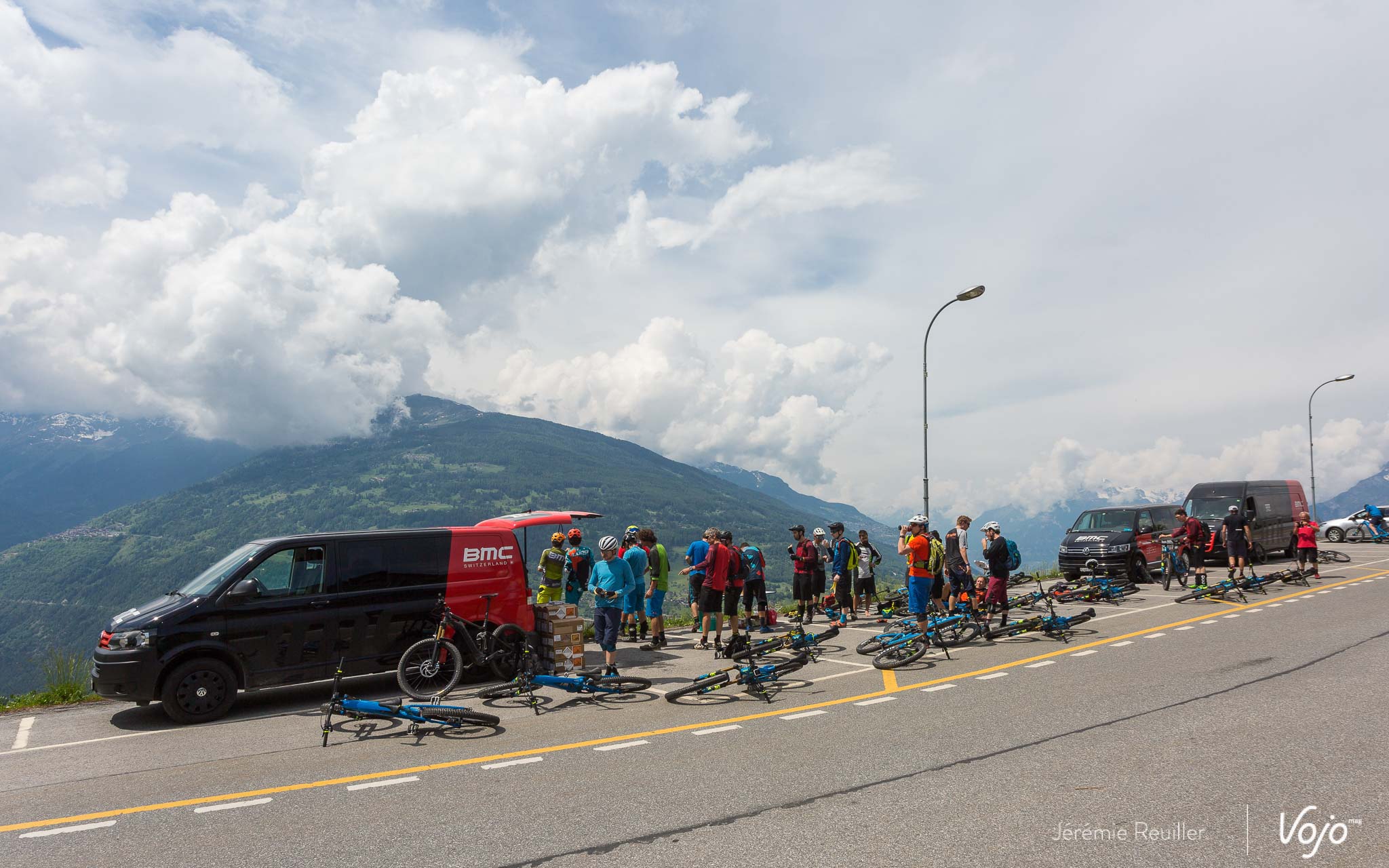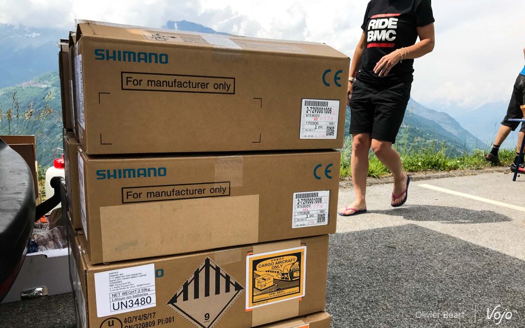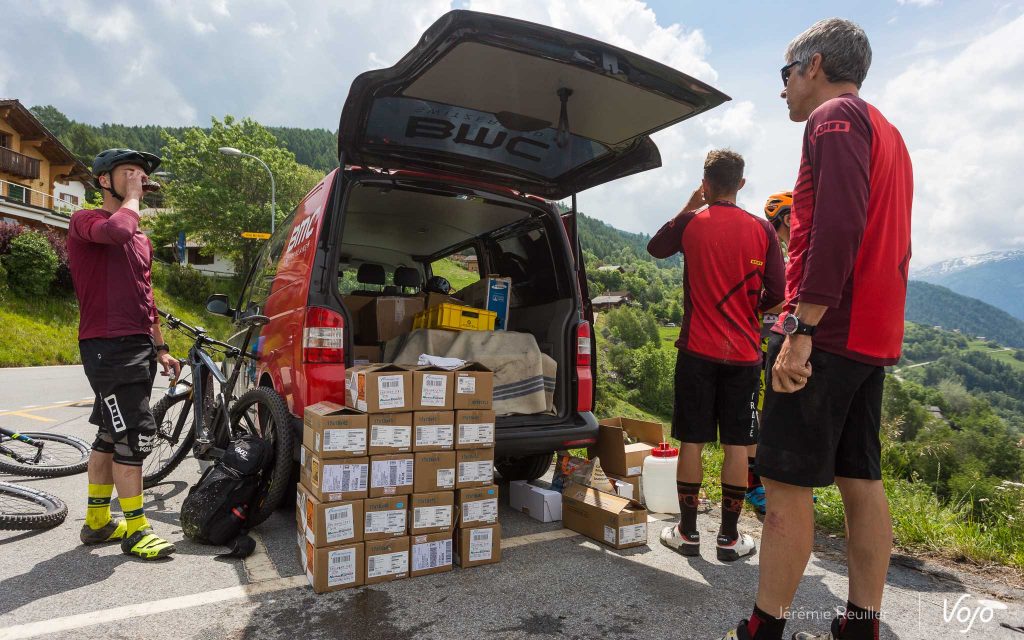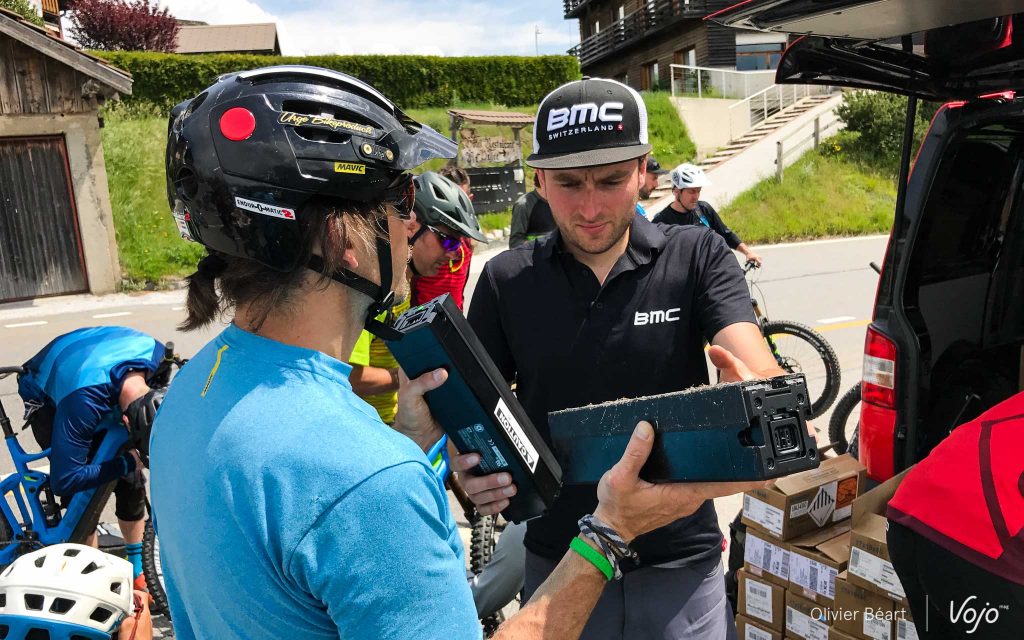 L’équipe BMC est aux petits soins, Denis et Mélanie en tête. La logistique est impressionnante, avec une camionnette pleine de batteries pour nous permettre de continuer le trip. Pour ma part, je n’ai consommé que deux barrettes sur les 5, mais vu le dénivelé qui nous attend encore, c’est plus sage de changer. Une opération facile qui nécessite tout de même d’avoir une clé antivol avec soi. Attention aux distraits !