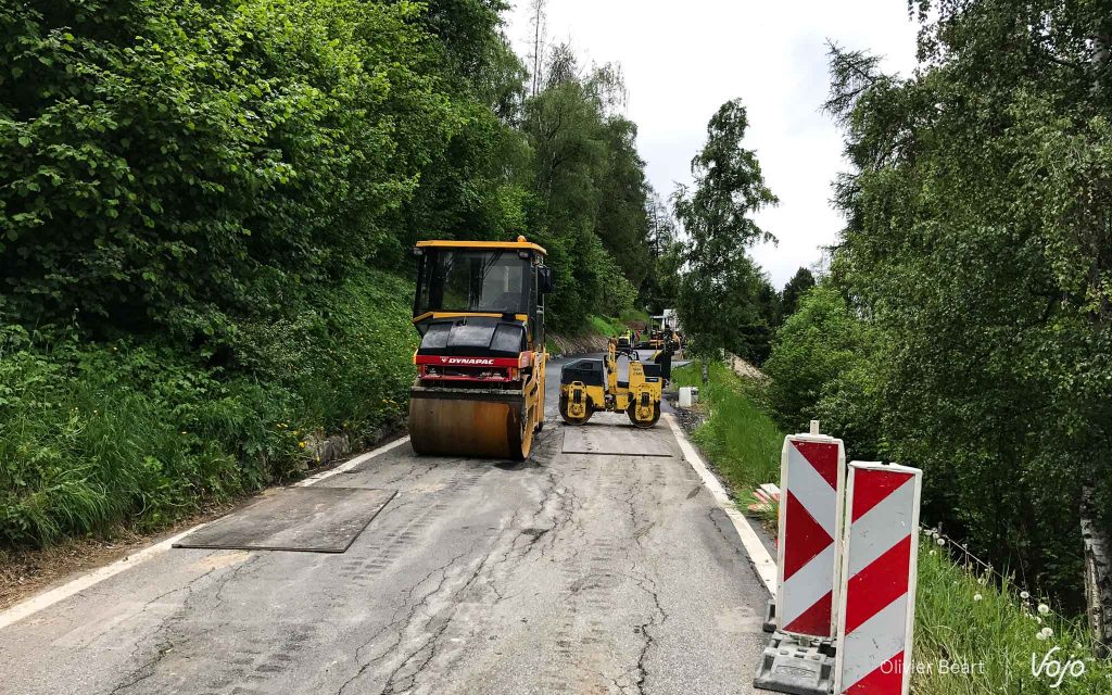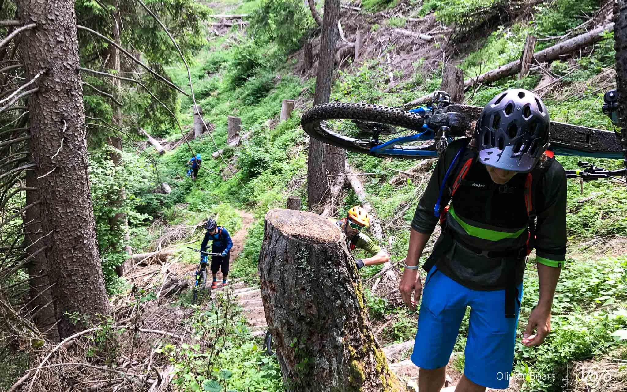 Une route coupée pour travaux d’asphaltage : il faut trouver un plan B ! Alex Moos consulte sa carte et trouve un chemin… droit dans la pente ! Pendant près de 3km, il va falloir monter un sentier qui n’a rien de technique mais hyper raide. Avec déjà plus de 50 bornes et 2000m de d+ dans les jambes, voilà qui aurait pu se transformer en un véritable enfer obligeant à porter le vélo pendant quasiment 1h.