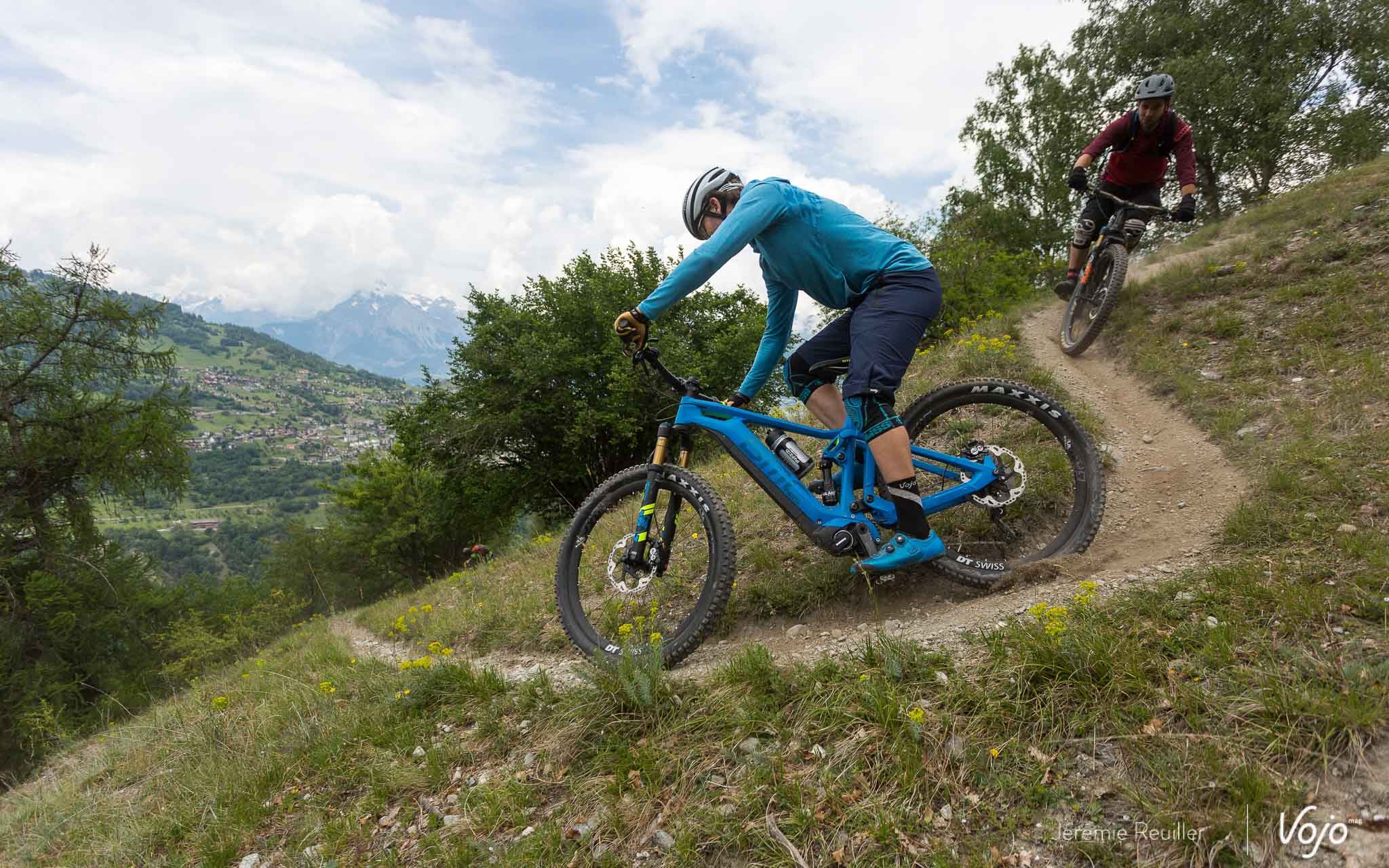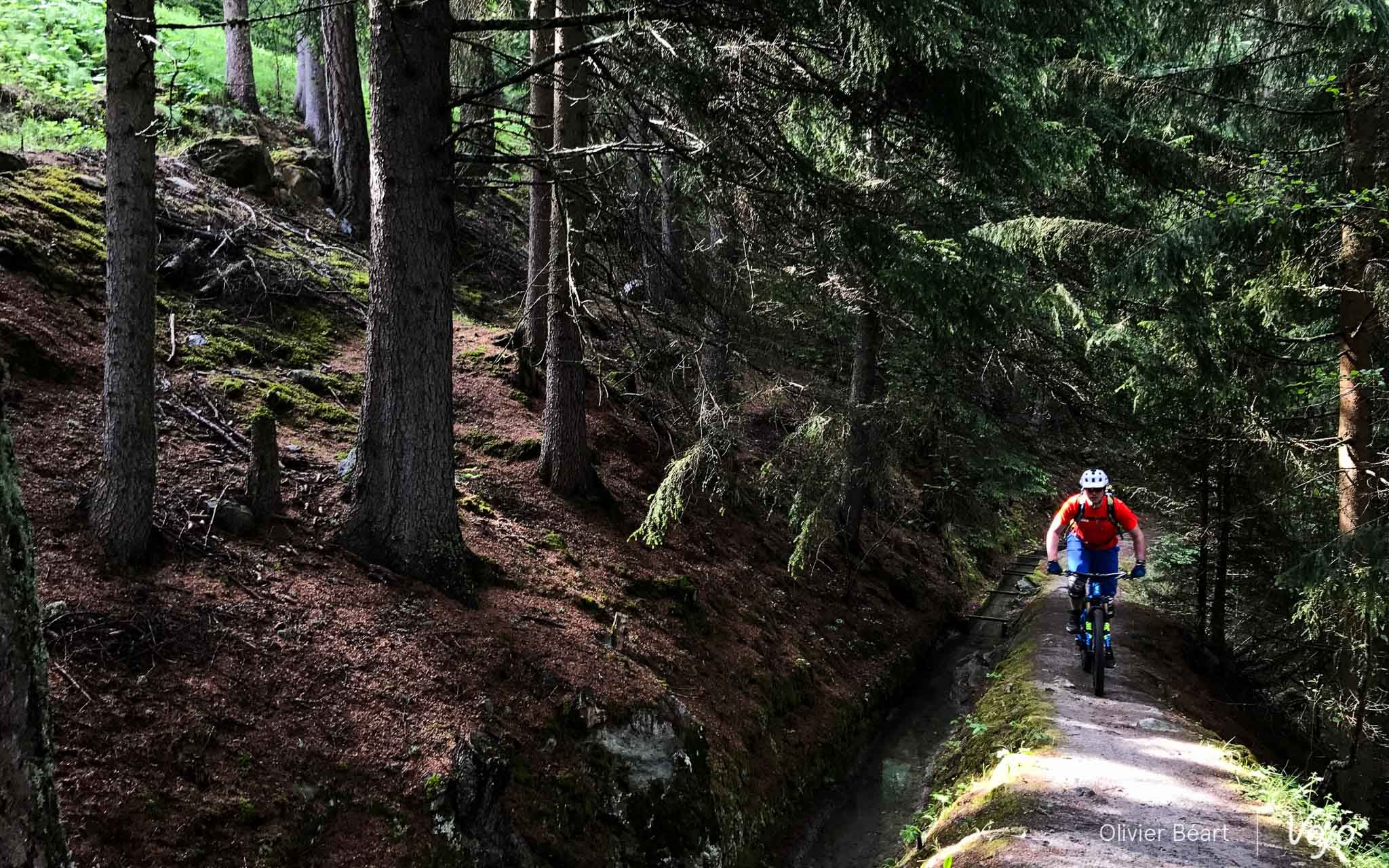 Heureusement, on commence plutôt soft quand on s’enfonce dans les premiers singletracks, avec de magnifiques sentiers qui longent les bisses, ces petits canaux d’irrigation typiques du Valais et qui récupèrent l’eau des torrents pour l’acheminer vers les villages. Dans les petits virages, le BMC Trailfox AMP se montre facile et joueur. Il n’a rien d’une péniche et c’est tant mieux !