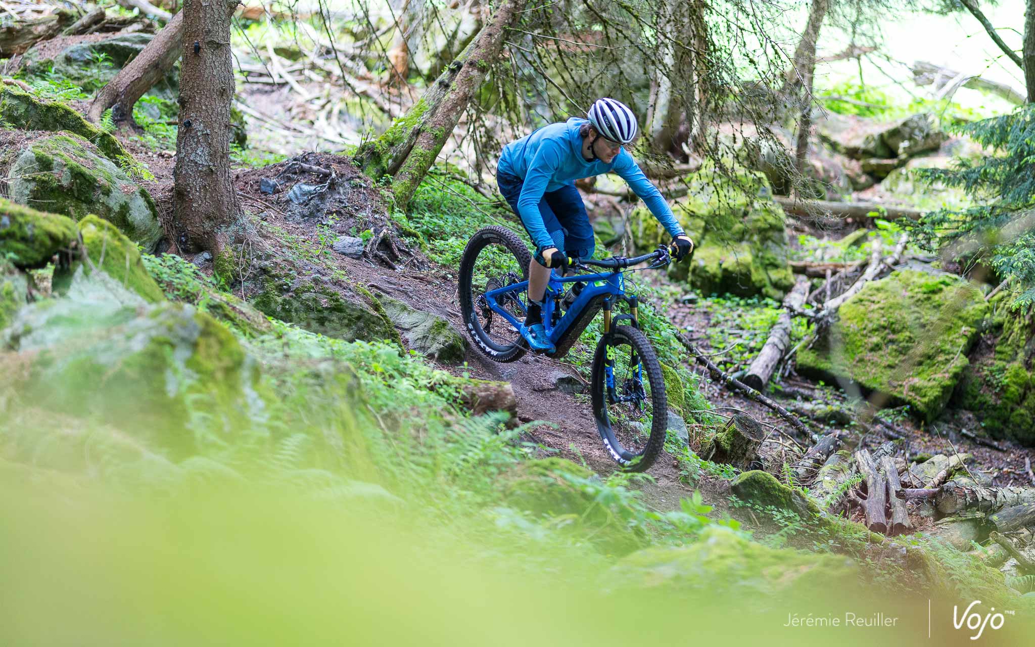 Quand on s’enfonce dans la forêt, l’ambiance se fait plus humide. Les nuages s’accrochent à la montagne et même si du soleil est annoncé pour toutes la journée, les pluies de la nuit ont ici laissé des traces. Le sol est humide, les cailloux et les racines glissantes. Un véritable piège, surtout en ebike vu le poids de l’engin, difficile à rattraper quand on part à la faute. Pas toujours facile non plus de délester les roues pour sauter au-dessus des obstacles.