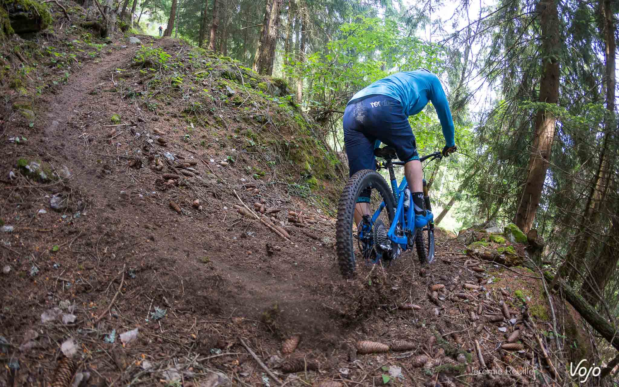 Sans transition, on attaque une descente raide aux multiples virages en épingles. Le sol souple mais accrocheur est cette fois complètement à l’avantage du vélo. Je retrouve le sourire en me jetant d’un virage à l’autre. Ici, le poids s’oublie et la rigidité du vélo facilite les placements. La géométrie fait aussi des merveilles, mêlant une stabilité redoutable dans les portions droites avec une remarquable aisance dans les portions étroites et serrées où il faut tourner dans un mouchoir de poche.