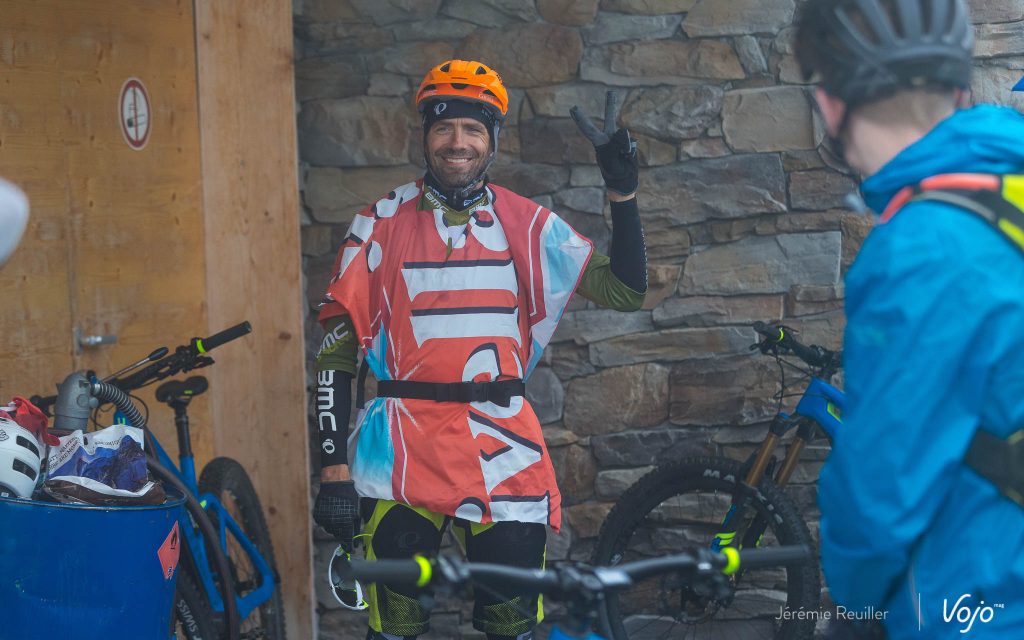 Dans la roue de l’Américain Travis Engel, j’attaque sans retenue, je tente de le passer à l’occasion de quelques dédoublements du sentier, sans succès car le gaillard est tenace et a un sacré coup de guidon ! En bas, tout le monde rit aux éclats, se tape dans les mains, exulte en racontant les anecdotes de la descente. Voilà un pur moment de vtt et de convivialité !