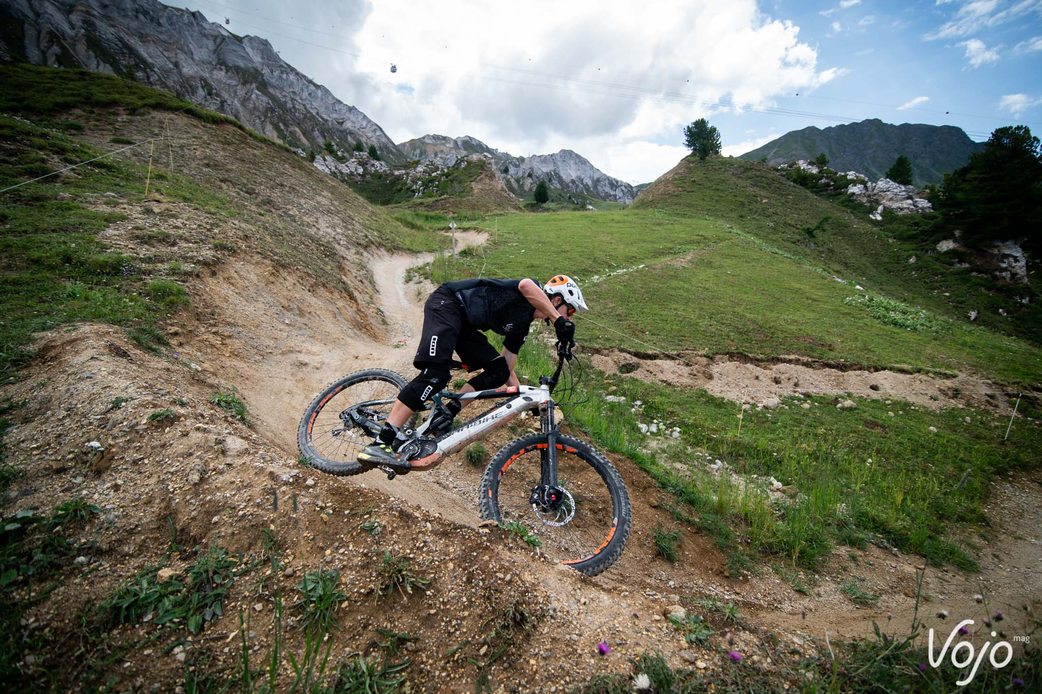 L’équipement passé en revue, passons aux qualités dynamiques de la machine. Nous l’avons prise en main sur le bike park de La Plagne, entre les roues de ses concepteurs, avant de basculer sur des sentiers plus naturels et techniques plongeant dans la vallée.
