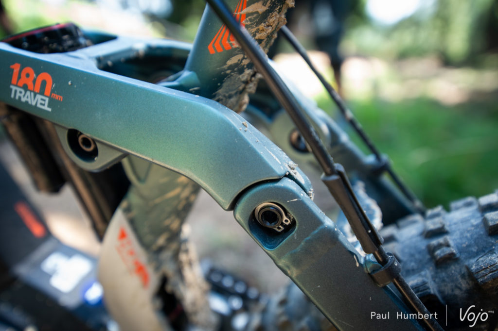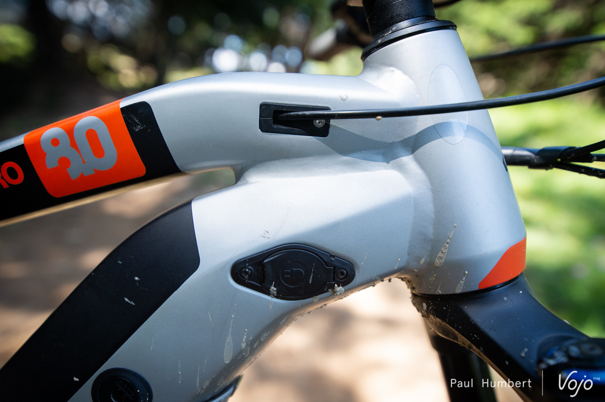 L’essentiel de la câblerie traverse le cadre en interne via le tube supérieur, pour ressortir derrière le tube de selle. Ce cheminement pourrait, à notre sens, être revu puisque le vélo, en se comprimant, fait entrer les câbles et gaines en contact avec les jambes du VTTistes.