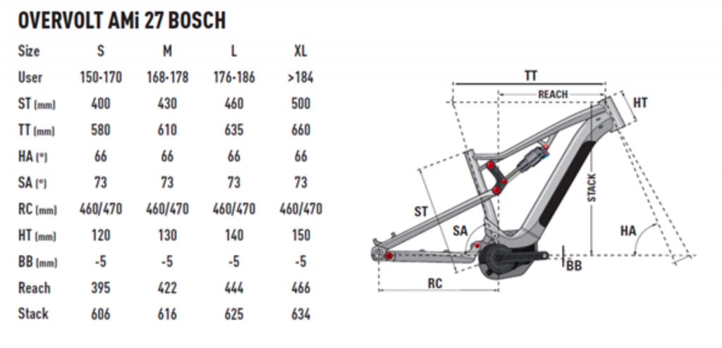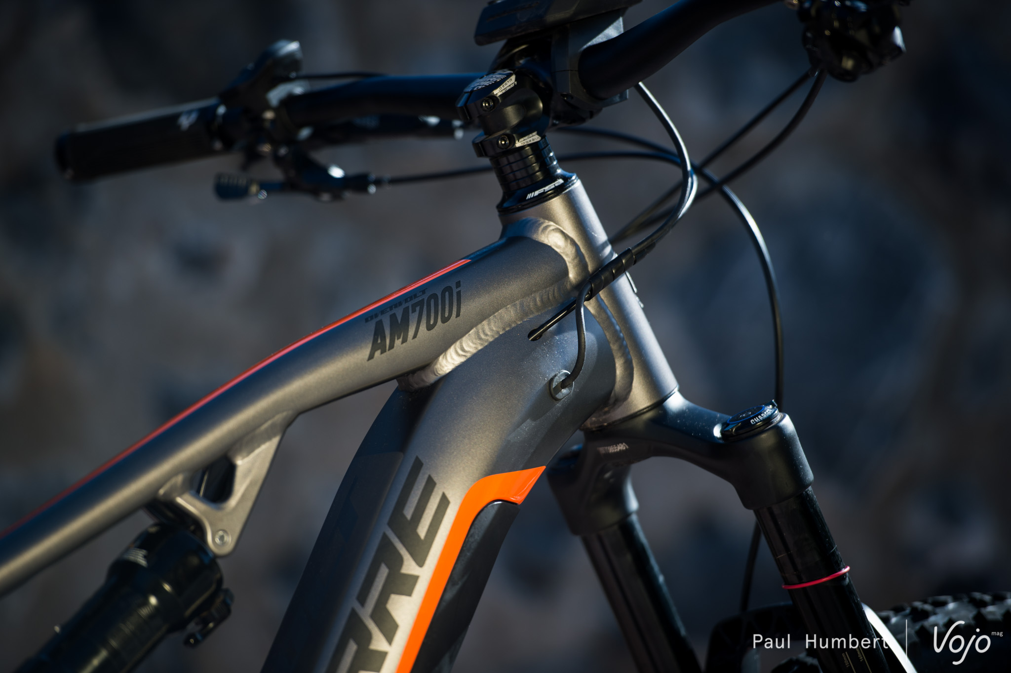 Le vélo reprend des cotes adaptées à une pratique « All-Mountain ». Rien n’est extrême mais tout s’harmonise. Les bases sont raccourcies, le triangle arrière est plus compact quand l’avant est plus long. L’empattement général du vélo est 1cm plus long que l’Overvolt AM en carbone. Le reach en taille M est de 422mm, les bases affichent 460 ou 470mm et l’angle de direction est de 66 degrés.