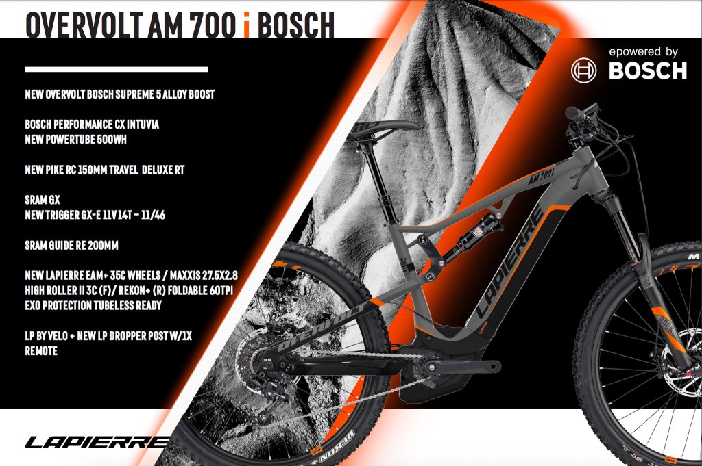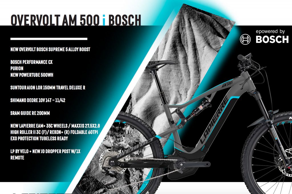 L’annonce n’est pas une surprise, Bosch offre désormais des solutions d’intégration de sa nouvelle batterie baptisée Powertube. Avec ses 500Wh, elle trouve place sur un nouveau chassis, le Lapierre Overvolt AM i (« i » pour « intégré »). Ce dernier ne remplace pas l’Overvolt AM présenté l’année dernière et qui est, lui, équipé d’un châssis en carbone, alors que le petit nouveau est en aluminium (Suprême 5).